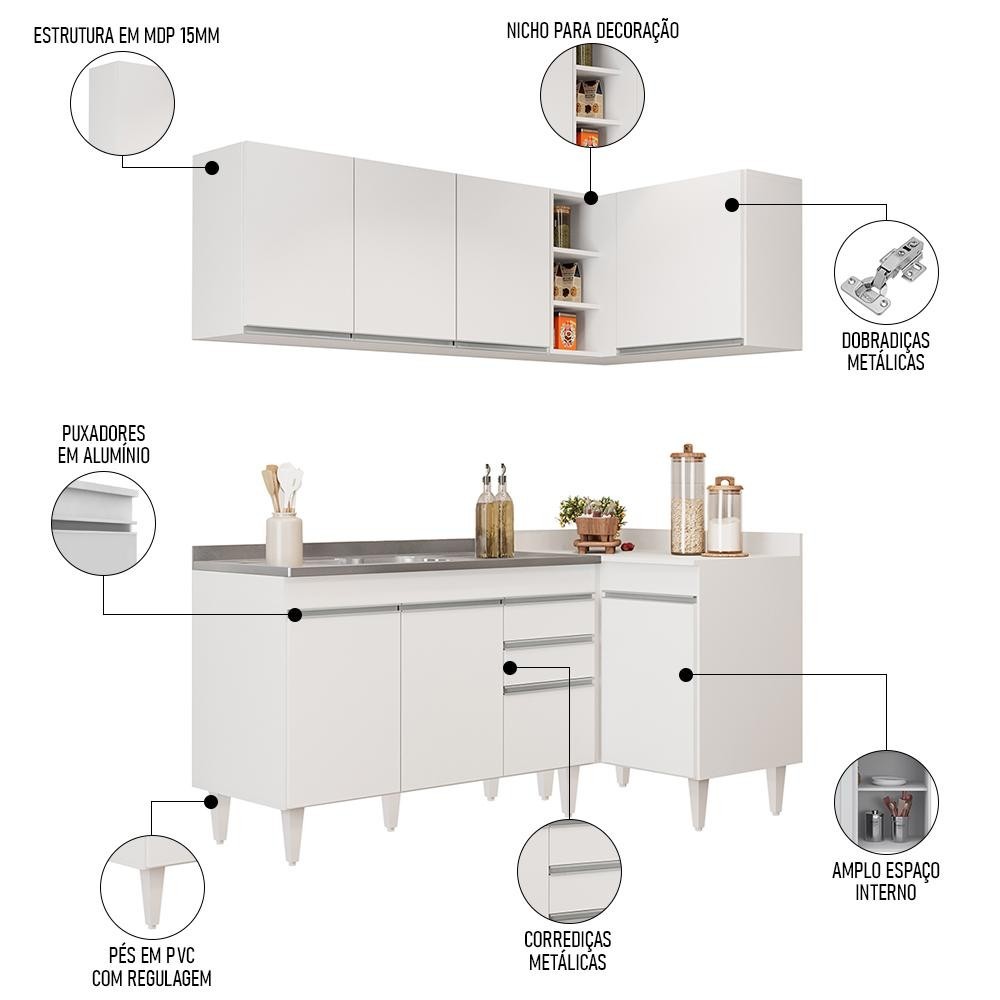 Armário de Cozinha Modulado de Canto Esquerdo 4 Peças CP48 com Pia Inox Branco - Lumil