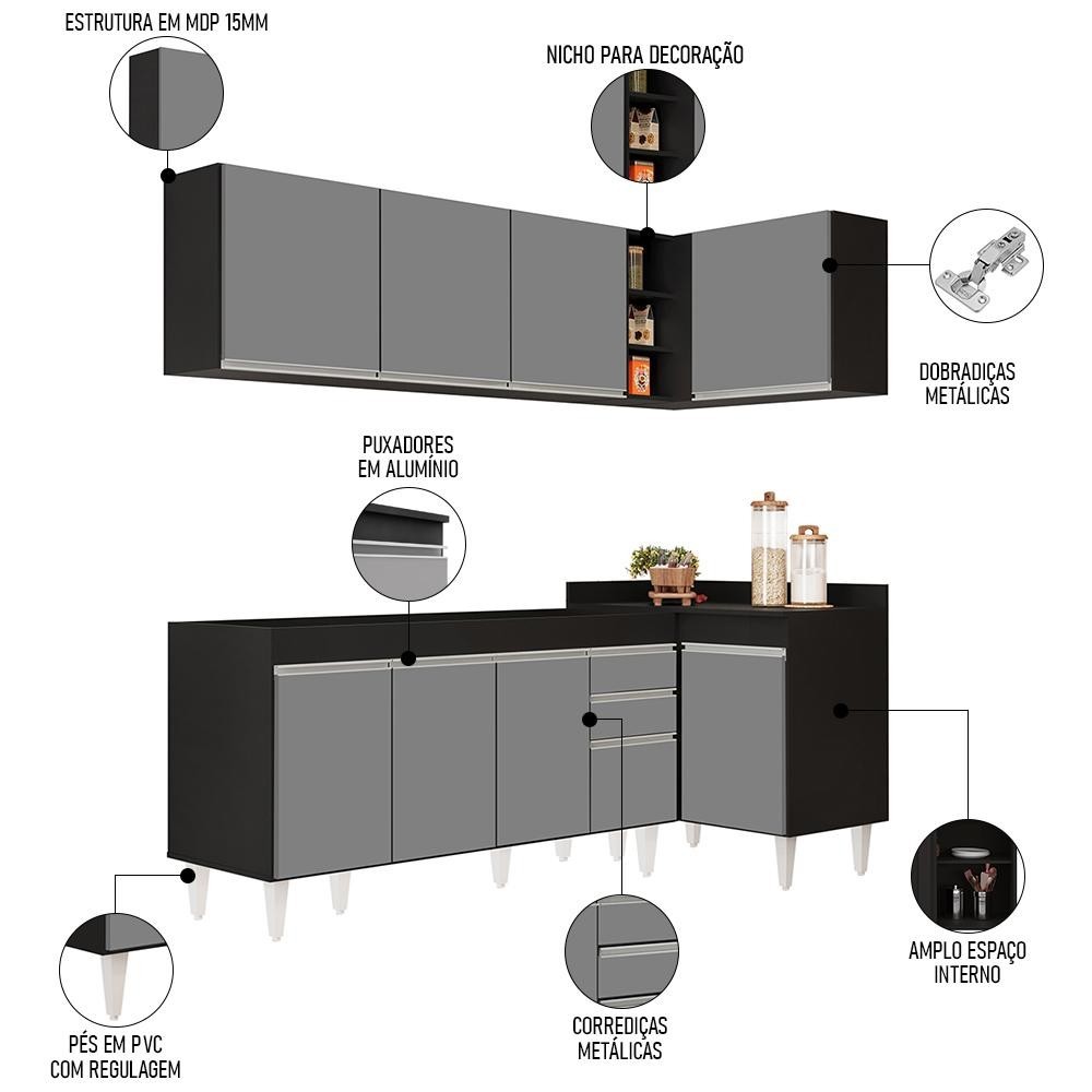 Armário de Cozinha Modulado de Canto Esquerdo 4 Peças CP49 Balcão sem Tampo Preto/Cinza - Lumil
