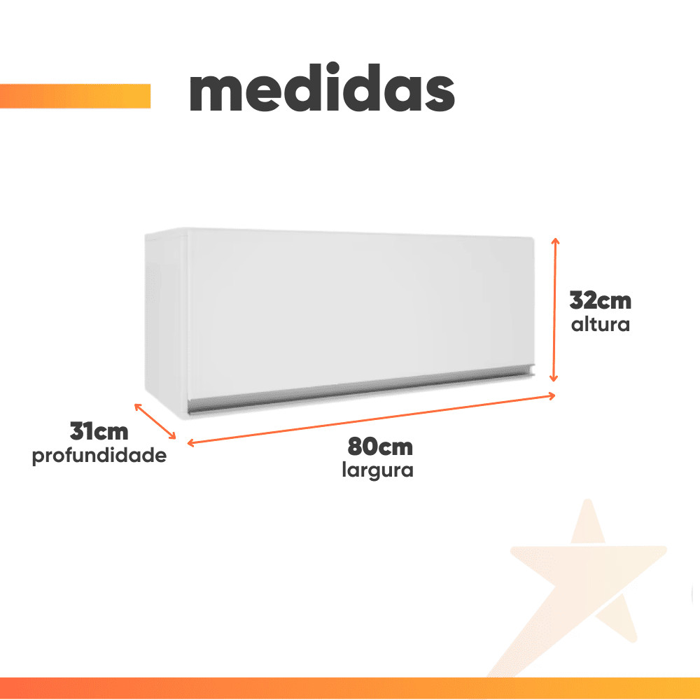 O Armário Geladeira Top Class é o produto ideal para quem procura praticidade e beleza, podendo ser usado sozinho ou como complemento da cozinha modelo Top Class. Com 1 porta basculante e amplo espaço interno, puxador em alumínio dando um charme todo especial ao produto. Estrutura em MDP revestido em ff e fundo em MDP, pintura uv, dobradiças metálicas 26mm e pistão a gás. MEDIDAS: [ A ] = 32 cm [ L ] = 80 cm [ P ] = 31 cm PESO: 10kg PESO SUPORTADO: 5 Kg MODELO: Armário Geladeira Top Class MARCA: Batrol COR: Branco MATERIAL LATERAIS: MDP de 15mm revestido em ff Branco Fosco MATERIAL PORTA: MDP de 15mm com Pintura Ultra Violeta Grafite com Brilho MATERIAL FUNDO: em MDF DOBRADIÇA: Metálica de Pressão CANTONEIRA: Metálica Estrutural PUXADOR: Alumínio PISTÃO: A gás ITENS INCLUSOS: 1 Armário Aéreo de Geladeira, 1 Manual de Montagem, 1 Kit Parafusos GARANTIA: 3 Meses A Esplanada Móveis se responsabiliza pela entrega dos produtos adquiridos até a porta de entrada ou portaria do endereço indicado, se a portaria do condomínio permitir, as entregas são efetuadas no piso térreo e é de responsabilidade do cliente a locomoção da mercadoria até seu apartamento ou casa. Confira as dimensões do produto e certifique-se de que estão adequadas aos elevadores, portas e corredores do local da entrega. Não fazemos a montagem, desmontagem do produto e/ou portas e janelas, transporte pela escada ou içamento pelo lado de fora do prédio. Não está incluso no serviço de entrega o deslocamento até o interior do apartamento, com ou sem elevador, ou deslocamento em locais de difícil acesso como escadarias. Caso o cliente necessite de entrega dentro das dificuldades mencionadas, deverá entrar em contato para análise e cotação do valor do serviço. Certifique-se de tudo antes de finalizar a compra, evitando assim futuros desagrados ou imprevistos com a entrega...