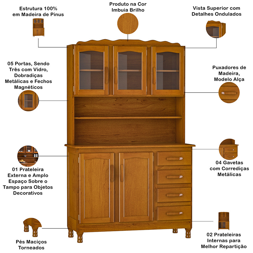 Maximize o espaço e o charme da sua cozinha com o Armário Kit Évora, da Lyam Decor, confira! Com 5 portas (sendo 3 com vidro), esse kit de cozinha oferece uma ampla capacidade de armazenamento. Use as portas de vidro para exibir sua louça bonita ou taças, criando um visual convidativo, e as portas de madeira para guardar itens que precisam ficar escondidos. Além disso, as 4 gavetas e pés torneados combinam a funcionalidade que você precisa com o design rústico que torna qualquer ambiente mais aconchegante. Por fim, é fabricado em madeira maciça, o que o torno um móvel para durar anos, unindo robustez e bom gosto. Não espere mais. Adicione ao seu carrinho e deixe a sua cozinha da cidade ou do campo cheia de charme e funcionalidade! Dimensões do produto (L x A x P) 120 x 194,5 x 47,5 cm. Características: Estrutura 100% em madeira de pinus, acabamento Imbuia Brilho. 04 gavetas com corrediças metálicas. 05 portas, sendo três com vidro, dobradiças metálicas e fechos magnéticos. 02 prateleiras internas para melhor repartição. 01 prateleira externa e amplo espaço sobre o tampo para objetos decorativos. Puxadores de madeira, modelo alça. Vista superior com detalhes ondulados. Pés maciços torneados. - Produto entregue desmontado, acompanha acessórios e manual de montagem. - Este produto deve ser limpo com pano macio e seco. Não utilize produtos abrasivos como álcool e detergente, assim como esponjas rígidas ou palha de aço. - Proteja a superfície do móvel de objetos que transmitam calor ou umidade. Observações importantes: - Produto para uso residencial em ambiente interno, não devendo ficar exposto diretamente ao sol, calor e umidade excessivos. - Pode haver alguma diferença de tonalidade entre a imagem e o produto real, por conta do tratamento de imagens e a calibração de cores do seu monitor. - As imagens são meramente ilustrativas, não acompanham objetos de decoração e eletrônicos. - Ao receber a mercadoria, o cliente deve verificar as condições da embalagem, caso haja alguma avaria não assine o comprovante de recebimento. - Montagem, desmontagem e outras instalações serão de responsabilidade do cliente. Não nos responsabilizamos, no ato da entrega, por subir escadas/elevadores ou pelo transporte por guincho em apartamentos. Eventuais despesas são de responsabilidade do comprador. - Confira as dimensões do produto e certifique-se de que passará normalmente por supostos elevadores, portas, escadas e/ou corredores de sua residência.