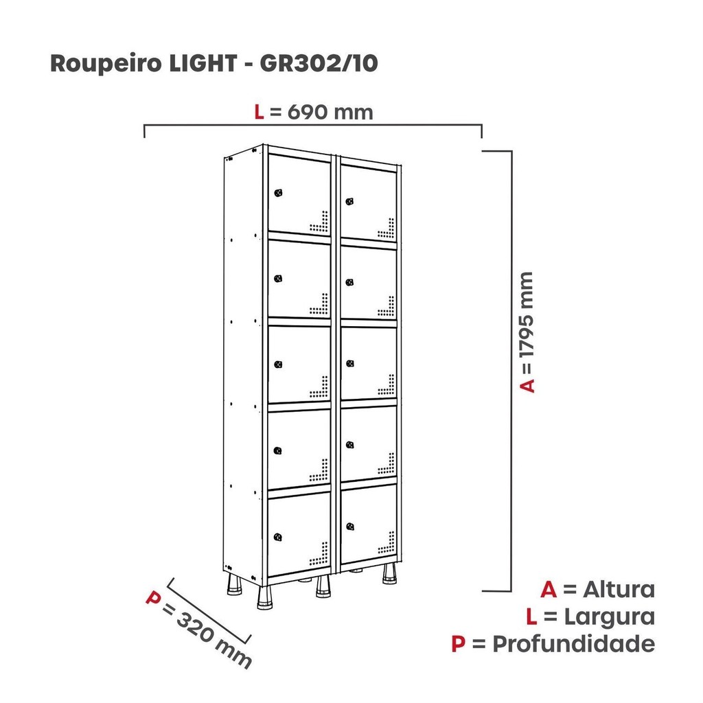 Armário Locker Guarda Volume Aço Light 10 Portas 69x179,5cm Cinza/Branco