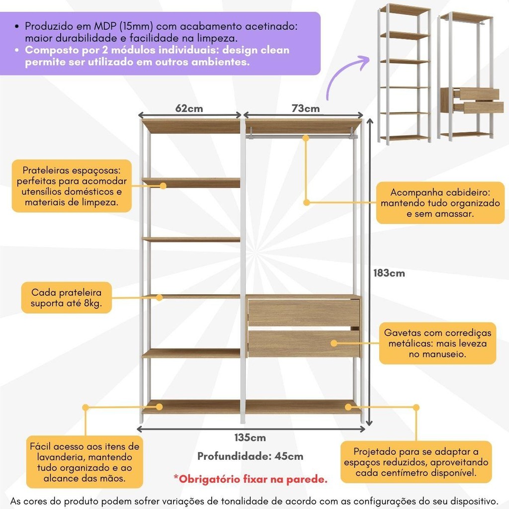 O Armário Multiuso de Lavanderia Modulado 135cm 2 Peças Multimóveis MP5058 é a solução ideal para organizar e otimizar o espaço da sua área de serviço. Durabilidade e funcionalidade: Produzido em MDP de 15mm com acabamento acetinado (cerca de 20% de brilho), este móvel entrega sofisticação e resistência para o seu dia a dia. Composto por 2 módulos individuais, permite que você monte da forma que melhor se adaptarem ao seu ambiente, proporcionando flexibilidade total ao seu jeito de viver. Amplo espaço interno e elegância: O armário é equipado com 7 prateleiras espaçosas (suportam até 8kg em cada), ideais para manter produtos de limpeza e utensílios de lavanderia organizados de forma inteligente, ajudando você a criar um ambiente mais eficiente e funcional para as tarefas domésticas. O cabideiro de madeira revestido garante que suas roupas, sejam longas ou curtas, fiquem sempre impecáveis. Além disso, com 2 gavetas que possuem corrediças metálicas, o manuseio ganha leveza e praticidade. O design aberto e moderno que realça qualquer espaço. Conteúdo da Embalagem: 1 (um) Módulo com Prateleiras 62cm 1 (um) Módulo com Gavetas e Cabideiro 73cm Manual de Montagem Kit Ferragem Especificações Técnicas: Dimensões do Produto Montado - Altura: 183cm | Largura: 135cm | Profundidade: 45cm Material: MDP 15mm Acabamento: Acetinado Quantidade de Prateleiras: 7 Quantidade de Gavetas: 2 Corrediças: Metálicas *Você pode consultar as medidas detalhadas na imagem técnica do produto. *As cores dos produtos podem sofrer variações de tonalidade de acordo com as configurações do seu dispositivo. *Obrigatório fixar o móvel na parede. Aqui na Loja Multimóveis, você pode concluir sua compra facilmente com toda segurança. A entrega é garantida e aqui você está em 1° lugar. Imagem meramente ilustrativa. Decoração não acompanha o produto. Os produtos serão entregues desmontados e não disponibilizamos o serviço de montagem.