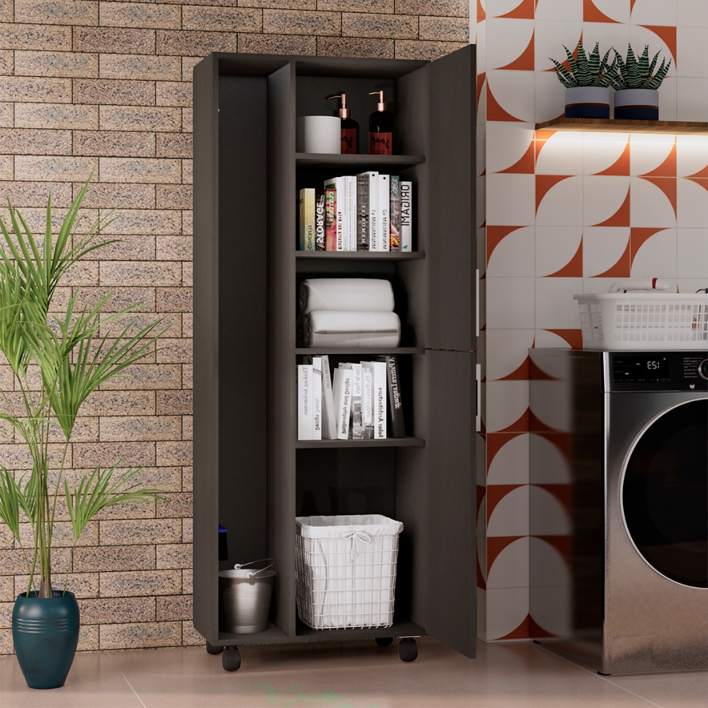 Armário Multiuso Lavanderia 2 Portas com Rodizios Porta Vassouras 5 Prateleiras Organizador
