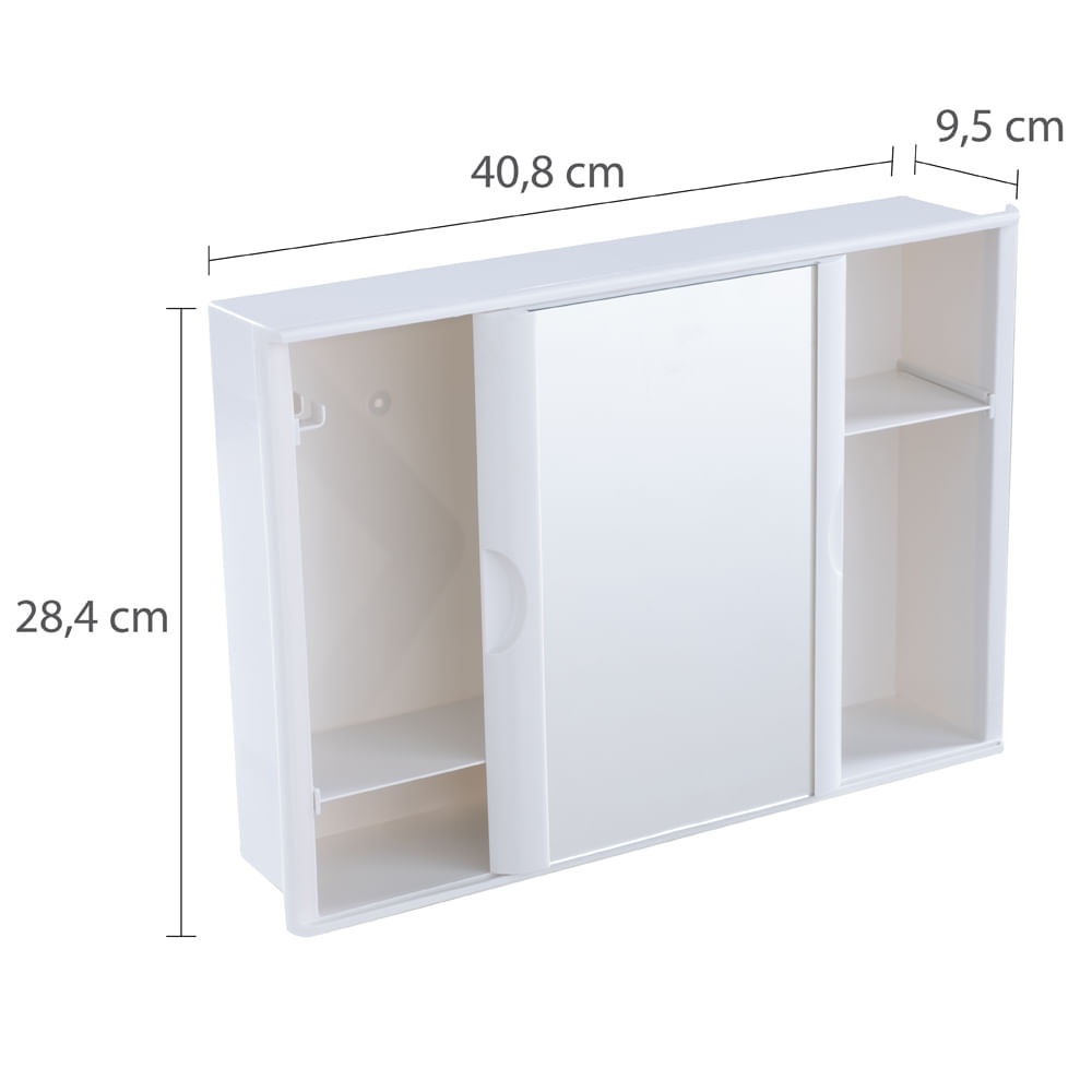 Armário Plástico Versátil com Porta de Correr 29x41x10cm de Embutir e Sobrepor Astra Branco 1 O Armário Plástico Versátil com Porta de Correr da Astra possui porta de correr com espelho que desliza em todo o armário, otimizando o espaço. O armário é funcional, já vai montado e pode ser instalado embutido ou sobreposto à parede. Características Possui porta de correr, otimizando o espaço. Espelho que desliza em todo o armário. Divisão interna com porta-escova e prateleiras embutidas para armazenar os objetos do dia a dia. Leve, resistente e de fácil limpeza. Pode ser instalado embutido ou sobreposto à parede. Recomendações e uso Limpeza - Tecido macio, seco ou levemente umedecido. Informações Técnicas MODO DE INSTALAÇÃO Sobrepor e Embutir MATERIAL PS ACABAMENTO Fosco ABERTURA DA PORTA Porta de Correr QTDE DE PORTAS 1 Porta (s) ACOMPANHA ESPELHO Sim DIMENSÃO DO PRODUTO (CxLxA) 40,8 x 9,5 x 28,4 cm ESPELHO INTERNO Não QTDE PRATELEIRAS 4 Prateleiras TIPO MATERIAL Plástico MANUAL Sim GARANTIA 3 meses ITENS INCLUSOS 1 kit fixação INFORMAÇÕES As cores do produto podem sofrer variações de acordo com o dispositivo, a iluminação do ambiente ou a sua percepção visual. Fotos meramente ilustrativas. Os objetos que compõe a foto ambientada não acompanham o produto.