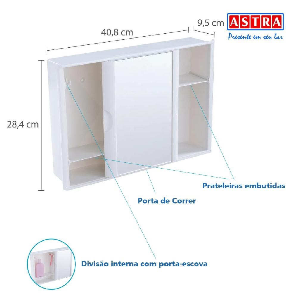 ARMÁRIO PLÁSTICO VERSÁTIL 28,5X41X9,5CM ASTRA - VERSÁTIL E FUNCIONAL DE EMBUTIR E SOBREPOR! DESCRIÇÃO O Armário Plástico Versátil com Porta de correr da Astra possui porta de correr com espelho que desliza em todo o armário, otimizando o espaço. O armário é funcional, já vai montado e pode ser instalado embutido ou sobreposto à parede. CARACTERÍSTICAS - Possui uma exclusiva porta de correr, otimizando o espaço; - Espelho que desliza em todo o armário; - Divisão interna com porta-escova e prateleiras embutidas para armazenar os objetos do dia a dia; - Leve, resistente e de fácil limpeza; - Prateleiras e porta-escovas removível; - Pode ser instalado embutido ou sobreposto à parede. FICHA TÉCNICA - Modo de Instalação: Sobrepor e Embutir - Material: PS - Tipo de Material: Plástico - Acabamento: Fosco - Abertura da Porta: Porta de Correr - Quantidade de Portas: 1 Porta - Acompanha Espelho: Sim - Dimensão do Produto (CxLxA): 41 x 9,5 x 28,5 cm - Espelho Interno: Não - Quantidade Prateleiras: 4 Prateleiras - Manual: Sim - Itens Inclusos: 1 Kit de fixação RECOMENDAÇÕES DE USO - Atenção ao instalar o armário, tome muito cuidado para não colocá-lo de cabeça para baixo, pois isso fará com que o espelho caia; - Limpeza com tecido macio, seco ou levemente umedecido. MODO DE USAR: Coloque o armário de forma que os orifícios para Fixação estejam na parte superior. A prateleira e o porta-escovas devem ser posicionados após a instalação do armário. Para instalar os porta-escovas e as prateleiras, coloque-os nos trilhos localizados na parte interna do armário e empurre-os até o fim. Atenção ao instalar o armário, tome muito cuidado para não colocá-lo de cabeça para baixo, pois isso fará com que o espelho caia; O QUE ACOMPANHA: - 01 Armario Plastico Versatil 41X9,5X28,5cm