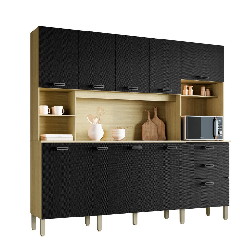 Armário para Cozinha 10 Portas 2 Gavetas Balcão com Tampo Intense Freijó/Nero