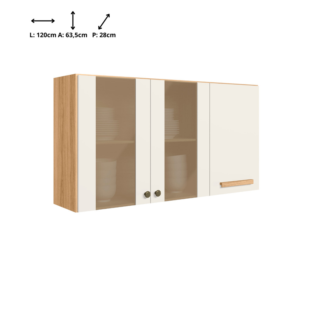 A Mega Fácil Móveis apresenta uma linda novidade, o armário modulado suspenso Intenza com 120cm. Com 3 portas sendo 2 de vidro, trás maior organização para seu ambiente. Pode ser utilizado em Lavanderia, banheiro, cozinha, quarto e até mesmo Sala de estar! Dimensões do produto montado: Altura: 63,5cm; Largura: 120cm; Profundidade: 28cm; Características: - Prateleira interna - Dobradiças metalicas - Pintura UV - Alto espaço interno - Puxadores de Madeira MDF - 2 Portas de vidro resistente OBS: Nossa loja não oferece serviço de montagem. Todos nossos móveis possuem manual de montagem com passo a passo para montagem junto a um profissional de confiança. CASO PRECISE DE MAIS DE UMA UNIDADE DO PRODUTO, REALIZAR EM COMPRAS DIFERENTES, CADA UMA COM 1 UNIDADE.