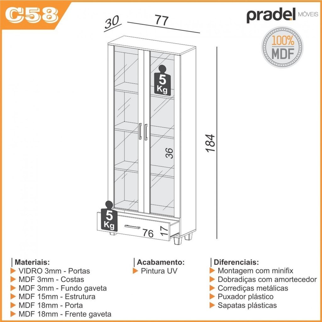 O armário estante C58 da Pradel Móveis é a solução ideal para quem busca organização e elegância no escritório ou sala de estar. Seu design combina a beleza do tom Freijó com a funcionalidade de portas de vidro, permitindo que você exiba seus livros e objetos decorativos favoritos enquanto os mantém protegidos. - Estrutura 100% MDF: Fabricado inteiramente em MDF com espessuras de 15 mm na estrutura e 18 mm na frente da porta e gaveta, este armário oferece robustez e uma longa vida útil, garantindo a estabilidade necessária para seus pertences. - Acabamento com Proteção UV: A pintura UV aplicada em toda a superfície não só realça a beleza da cor Freijó, mas também cria uma camada de proteção contra o desgaste diário, facilitando a limpeza e conservação do móvel. - Design Inteligente e Espaçoso: Com 184 cm de altura, 77 cm de largura e 30 cm de profundidade, este móvel aproveita o espaço vertical do ambiente. As duas portas de vidro protegem três prateleiras internas, e a gaveta inferior com corrediças metálicas é perfeita para guardar itens que precisam de mais discrição. - Detalhes que Fazem a Diferença: As portas contam com dobradiças com amortecedor para um fechamento suave e silencioso. Os puxadores externos, tanto nas portas quanto na gaveta, oferecem praticidade no manuseio diário, e os pés plásticos garantem a estabilidade do conjunto. - Capacidade para Organização: Cada prateleira e a gaveta foram projetadas para suportar até 5 kg, tornando o armário perfeito para organizar livros, pastas, documentos e coleções de forma segura e funcional. Acompanha 1 armário para escritório e kit de ferragens. Para uma compra certeira: Os itens decorativos das imagens não fazem parte do produto. Confirme se as medidas cabem no seu ambiente, considerando uma pequena folga de até 2 cm para manuseio. Peso (kg): 45 Garantia: 06 Meses Altura (cm): 184 Acabamento: Pintura UV Largura (cm): 77 Possui Pés: Sim Possui Rodízio: Não Possui Espelhos: Não Profundidade (cm): 30 Escala de Brilho: Fosco Material dos Pés: MDF Material da Porta: MDF Ambiente Principal: Escritório Material da Gaveta: MDF Material Principal: MDF Acabamento da Porta: Pintura UV Sapatas Niveladoras: Não Acabamento da Gaveta: Pintura UV Material da Prateleira: MDF Peso Máximo por Gaveta: 5 Acabamento da Prateleira: Pintura UV Tipo de Puxador da Porta: Externo Escala de Brilho da Porta: Fosco Tipo de Puxador da Gaveta: Externo Peso Máximo por Prateleira: 5 Tipo de Corrediça da Gaveta: Metálica Simples Material do Puxador da Porta: Plástico Material do Puxador da Gaveta: Plástico Escala de Brilho da Prateleira: Fosco Tipo de Dobradiça/Corrediça da Porta: Metálica Marca: Pradel Móveis Tonalidade: Marrom Deserto Cor: Freijó Cor do Produto: Freijó Itens Inclusos: 1 Estante, Kit Ferragens e Manual de Montagem Cor Predominante: Marrom