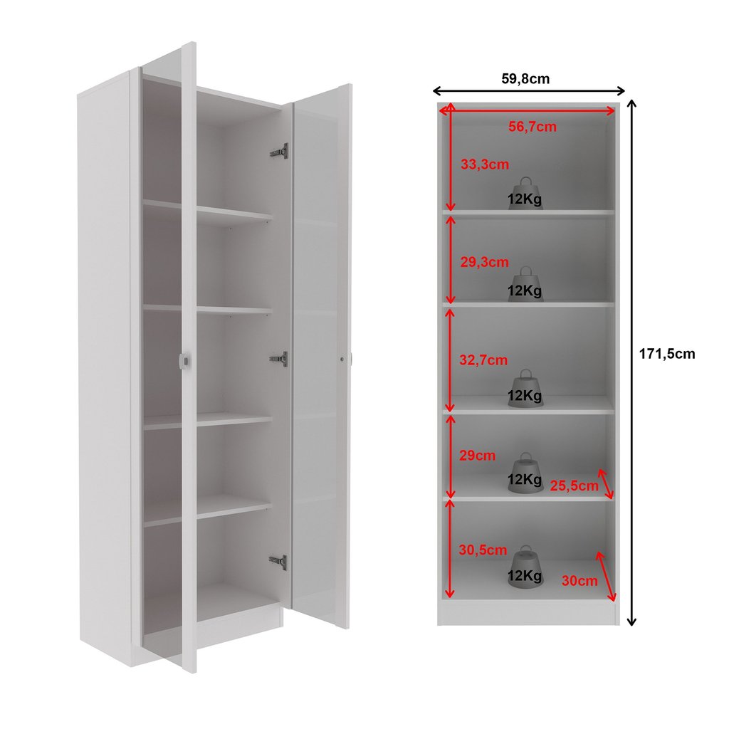 Esse Armário Multiuso alto é ideal para acomodar objetos ao seu estilo, pois possui 2 portas de vidro para melhor conservação dos produtos no seu interior, além disso, tem 4 prateleiras internas espaçosas e resistentes. O design é arrojado e diferenciado, você conseguirá acomodar os objetos ao seu gosto e dar um toque especial no visual da decoração no seu ambiente. Estilo: Decorativo Peso (kg): 29.9 Garantia: 03 Meses Altura (cm): 172 Acabamento: BP Largura (cm): 60 Possui Pés: Não Possui Nichos: Não Possui Portas: Sim Tipo de Porta: Bater Porta em Vidro: Sim Possui Gavetas: Não Tipo de Gaveta: Não Possui Porta com chave: Não Profundidade (cm): 32 Armário Suspenso: Não Escala de Brilho: Semi-Fosco Material da Porta: MDP Ambiente Principal: Escritório Espessura do Tampo (mm): 15 Formato do Armário: Retangular Material Principal: MDP Possui Prateleiras: Sim Tamanho do Armário: Alto (Acima de 150cm) Acabamento da Porta: BP Sapatas Niveladoras: Sim Localização do Nicho: Sem Nicho Possui Mesa Retrátil: Não Número de Prateleiras: 4 Orientação do Armário: Vertical Material da Prateleira: MDP Prateleiras Reguláveis: Sim Quantidade de Armários: 1 Acabamento da Prateleira: BP Tipo de Puxador da Porta: Externo Escala de Brilho da Porta: Semi-Fosco Peso Máximo por Prateleira: 12 Material do Puxador da Porta: PVC Tipo de Armário de Escritório: Totalmente Fechado Escala de Brilho da Prateleira: Semi-Fosco Tipo de Dobradiça/Corrediça da Porta: Metálica Marca: Tecno Mobili Cor: Branco Itens Inclusos: 1 Armário e Manual de Montagem. Cor Predominante: Branco Quantidade de Portas: 2 Portas Quantidade do Produto: 1