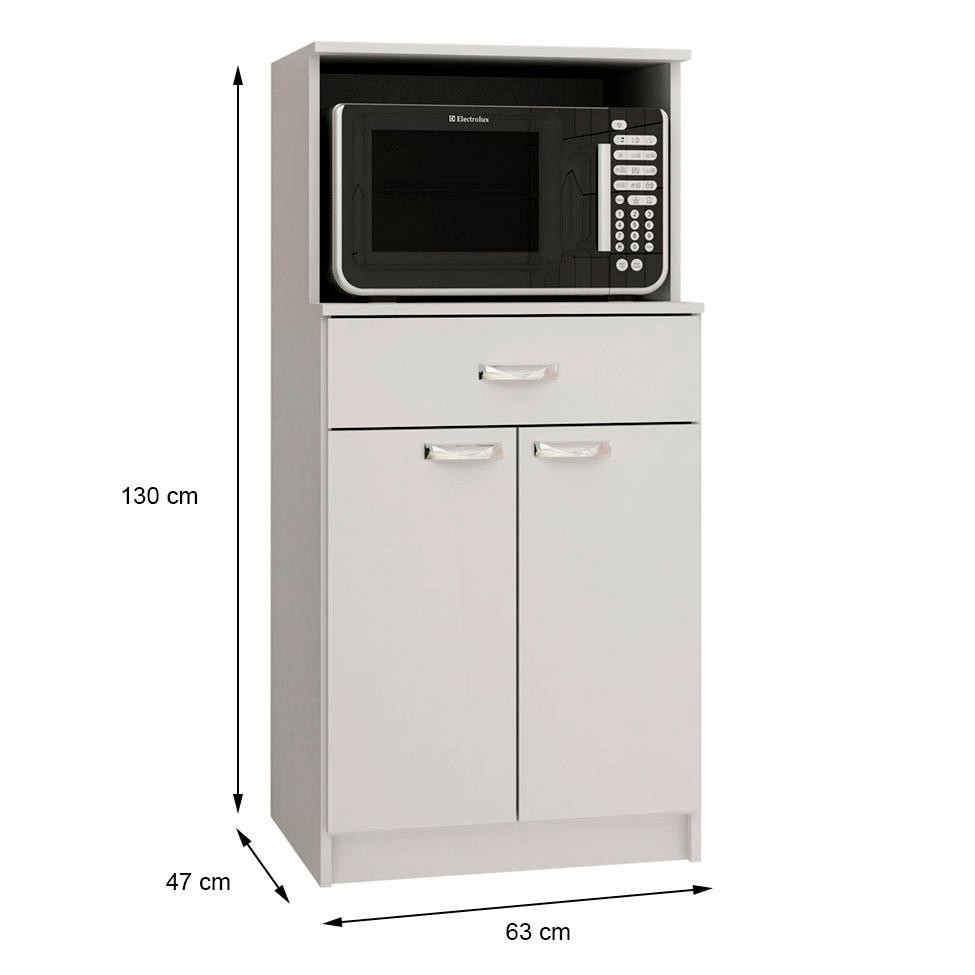 Que tal o Armário para Micro-ondas Rogue?O micro-ondas é um eletrodoméstico presente em diversas casas já que tem a função de facilitar a correria do dia a dia durante as refeições. E se esse é um item importante para você, o que acha de ter um espaço só para ele em sua cozinha? O Armário Rogue possui os compartimentos ideais para acomodar não só o produto, mas outros objetos de sua preferência na parte interna. Ah, a decoração do seu ambiente também tem muito a ganhar já que a cor branca oferece inúmeros benefícios e possibilidades na hora de combinar. Curtiu? Cor: Branco Garantia em Meses: 3 Cores do Produto: Branco Conteúdo da Embalagem: 01 Balcão Microondas Ambientes: Cozinha Modelo: Rogue Número de Volumes: 1 Material: MDP Material para Filtro: MDP Descrição do Tamanho: Altura: 130 cm | Largura: 63 cm | Profundidade: 47 cm Altura do Produto (cm): 130 Largura do Produto (cm): 63 Comprimento do Produto (cm): 47 Peso do Produto (Kg): 27 Produto precisa de Montagem?: Sim, sugerimos a contratação do nosso serviço de montagem (para os CEPs em que o serviço está disponível) ou de algum profissional experiente de sua preferência Divisória de Espaço: 0 Necessita fixação na parede: Não Número de Prateleiras: 1 Prateleira Gaveta com Divisórias: 0 Gaveta com trava: 0 Sapatas: 0 Cabideiro: 0 Número de portas: 2 Número de gavetas: 1 Material da estrutura: MDP Material do fundo: HDF Possui espelho/vidro: Não Possui Fruteira: Não Material do Tampo: MDP PROFUNDIDADE x LARGURA x ALTURA: 47 x 63 x 130 Fornecedor: Evidência Móveis Ltda Baterias são necessárias?: Não Certificação de teste externa: Não Componentes incluídos: Não Número da peça: Não Is Fragile: Não Produto: Balcão