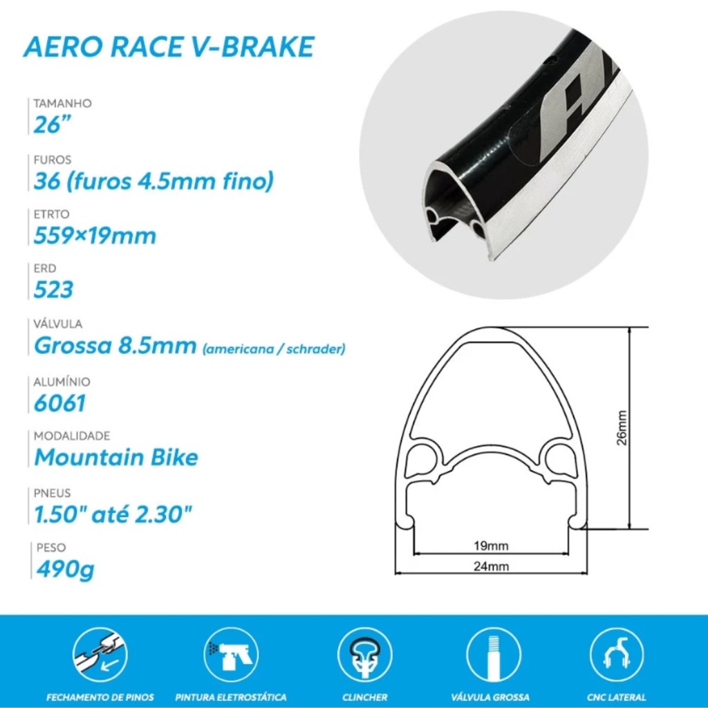 O Aro 26 Flay Aero Race é ideal para ciclistas que buscam leveza, durabilidade e desempenho nas pedaladas. Construído em alumínio de alta qualidade, ele oferece resistência para enfrentar trilhas, estradas e percursos urbanos com segurança. Com sistema compatível para freio V-Brake, proporciona excelente frenagem e fácil manutenção. Seu design com parede dupla garante maior rigidez e estabilidade, tornando a roda mais resistente a impactos e deformações. Especificações Técnicas: • Material: Alumínio de alta resistência • Tipo de freio: V-Brake • ERD: 586 mm • Furos: 36 • Tipo de válvula: Grossa (Schrader) • Compatibilidade de pneus: 1.3" a 2.3" • Parede: Dupla • Peso aproximado: 490 g