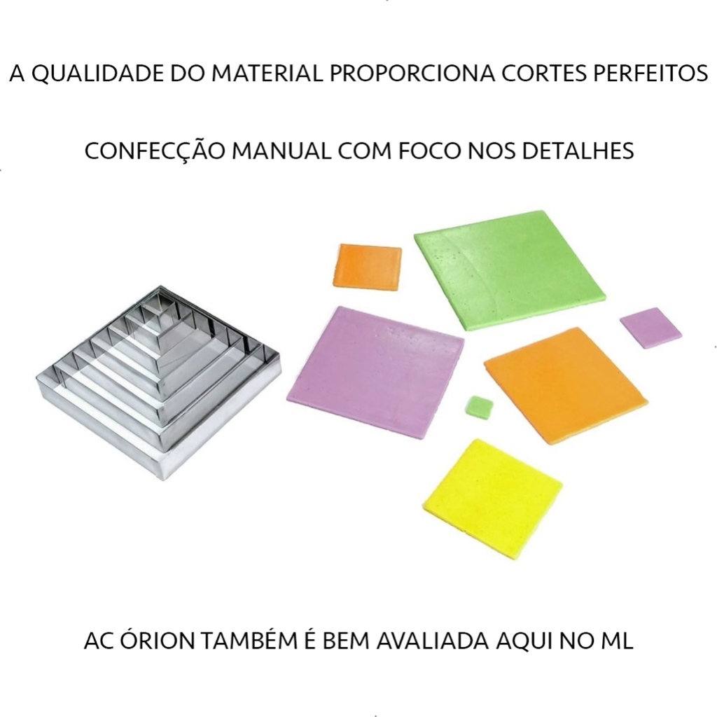 A AC ÓRION oferece a você mais do que variedade de produtos. Colocamos a nossa arte à disposição da sua criatividade e do seu talento. Confeccionamos cortadores para biscoitos, cortes em pasta americana e massas em geral, todos em aço inoxidável nos mais variados modelos e tamanhos. CARACTERÍSTICAS Material: Aço inoxidável Tipo: Jogo com 14 cortadores, formas redondo e quadrado de tamanhos variados Acabamento reforçado, possui precisão no corte facilitando muito seu trabalho! FUNCIONALIDADE Os cortadores podem ser utilizados na produção de biscoitos, em cortes de pasta americana, biscuit e massas em geral, tornando-se uma ferramenta útil tanto na confeitaria como no artesanato. MEDIDAS APROXIMADAS DOS CORTADORES Redondo diâmetro 2cm, com profundidade de 3cm Redondo diâmetro 4cm, com profundidade de 3cm Redondo diâmetro 6cm, com profundidade de 3cm Redondo diâmetro 8cm, com profundidade de 3cm Redondo diâmetro 10cm, com profundidade de 3cm Redondo diâmetro 12cm, com profundidade de 3cm Redondo diâmetro 14cm, com profundidade de 3cm Quadrado lado 2cm, com profundidade de 3cm Quadrado lado 4cm, com profundidade de 3cm Quadrado lado 6cm, com profundidade de 3cm Quadrado lado 8cm, com profundidade de 3cm Quadrado lado 10cm, com profundidade de 3cm Quadrado lado 12cm, com profundidade de 3cm Quadrado lado 14cm, com profundidade de 3cm ENVIO DO PRODUTO Nossos produtos são enviados em até 24 horas úteis após a confirmação do pagamento.