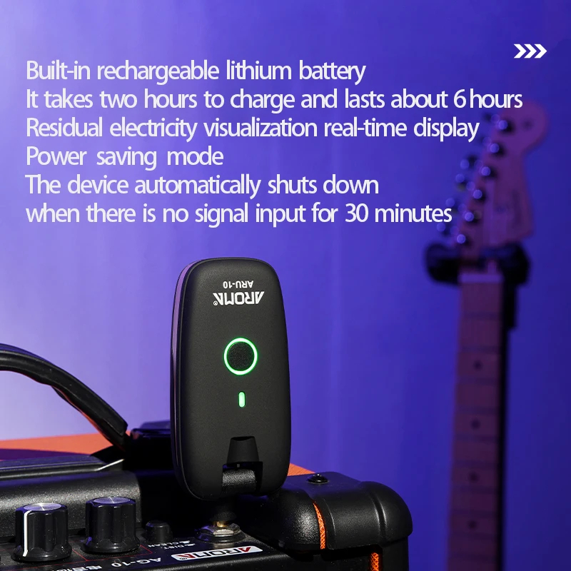 Como usar 1. Conecte o transmissor à guitarra O Aroma é adequado para todas as guitarras/baixos/baterias elétricas, inclusive guitarras elétricas estilo Stratocaster com sistemas de vibração. 2. Conecte o receptor ao amplificador Ligue o receptor; se a luz indicadora estiver acesa, significa que o receptor e o transmissor estão emparelhados. Se a luz indicadora piscar, isso indica que, devido à forte interferência de sinal, eles não são compatíveis, excedem a distância de transmissão ou o transmissor não está funcionando. Características: 1. Distância de transmissão >20 m 2. Banda de frequência sem fio: UHF 3. Método anti-interferência: Salto de frequência 4. Número de canais de sinal: 7 5. Bateria de lítio embutida: a duração da bateria excede 6 horas após o carregamento 6. Bateria de lítio: Após o carregamento por 2 horas, ela dura cerca de 4 a 5 horas Especificações: Bateria: Bateria de lítio recarregável de 3,7 V/950mAh Banda de frequência sem fio: UHF Lista de embalagem 1 * Sistema de guitarra sem fio 1 cabo USB 1 * Manual do usuário