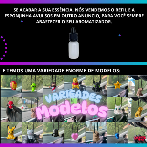 Obs: Ele já vai com a Essência. Cheirinho para Carro Exclusivo. Descubra a experiência única dentro do seu carro com o Aromatizador Automotivo da Venntos. Mais do que um simples cheirinho, este é um acessório de estilo, criado para transformar cada viagem em um momento especial. Com design exclusivo, sofisticado e diferente de tudo que existe no mercado, ele une fragrâncias marcantes a um visual moderno. Um produto único no mundo, pensado para quem valoriza originalidade, bem-estar e exclusividade em cada detalhe. Modo de Uso: Dentro do Aromatizador (Personagem), contém uma esponja redonda, retire a esponja do seu aromatizador e com o conta gotas de 5ml, aplique na esponja a sua essência escolhida, coloque a esponja dentro do aromatizador e pronto, é só pendurar o seu aromatizador no retrovisor interno e curtir. Contém: 1 Personagem Aromatizador (Feito de Plástico) 1 Esponja (Para gotejar a essência) 1 Aplicador conta gotas de 5ml já com o aroma que você escolhe no ato da compra. Durabilidade: O produto dura meses e é possível comprar o refil extra de 5ml da sua Essência Preferida. Sobre os Aromas: Zero KM Perfil: Cheiro de Carro novo premium. Descrição: Sensação de Carro Novo todos os dias: Black Edition: Perfil: Amadeirado Intenso Masculino. Descrição: Forte, Marcante e Sofisticado. Tutti Frutti: Perfil: Doce, tutti-frutti. Descrição: Aroma Doce e Viciante. Melancia: Perfil: Refrescante, Melancia Gelada. Descrição: Aquele cheirinho de melancia que todos amam. Sensação refrescante. Lavanda: Perfil: Lavanda, Floral. Descrição: É um aroma que traz sensações de conforto, equilíbrio, tranquilidade e higiene. Pink Velvet: Perfil: Perfume Feminino Elegante. Descrição: Sofisticação e feminilidade marcante. Morango Gold: Perfil: Morango, fresco e com um toque elegante de Luxo. Descrição: Experiencia Luxuosa com perfume doce, moderno e irresistível, não enjoativo. Citrus: Perfil: Limão siciliano fresco e Vibrante. Descrição: Notas Cítricas suaves e vibrantes, sensação de carro limpo, energia e frescor premium.