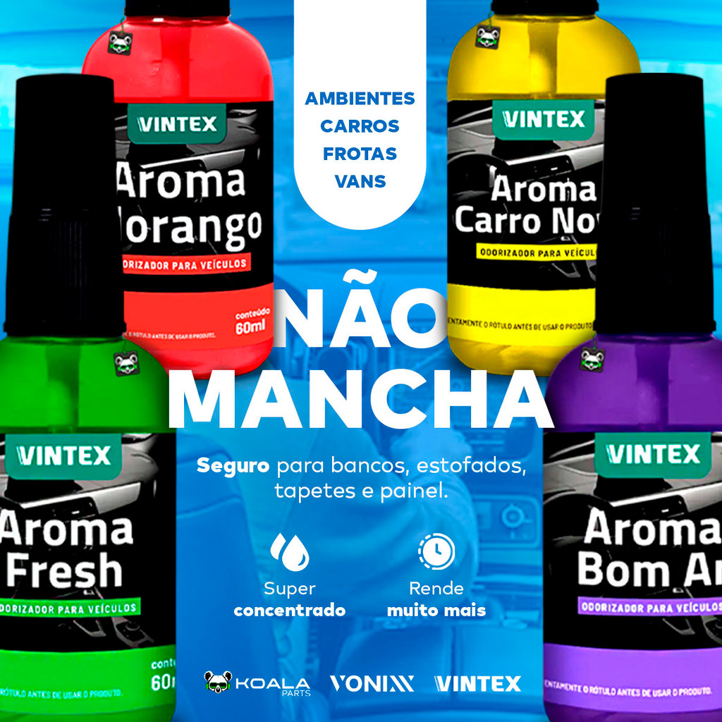 Arominhas em Spray 60ml – Vintex / Vonixx 🌿 Fresh • 🍓 Morango • 🚗✨ Carro Novo • 🌬️ Bom Ar AROMA MARCANTE, CONFORTO IMEDIATO! Os Arominhas em spray são produzidos com fragrâncias especiais e alta concentração, garantindo um aroma agradável e envolvente no interior do veículo por muito mais tempo. - Spray aromatizante - Fragrâncias marcantes e equilibradas - Longa duração com poucas borrifadas - Ideal para uso diário FRAGRÂNCIAS EXCLUSIVAS Escolha o aroma que mais combina com você: 🌿 Fresh: sensação de limpeza e frescor 🍓 Morango: doce na medida certa 🚗✨ Carro Novo: clássico e sofisticado 🌬️ Bom Ar: leve, agradável e equilibrado AROMA MARCANTE E DURADOURO Perfuma rápido e mantém o cheiro agradável por horas, sem ficar enjoativo. ALTA CONCENTRAÇÃO Poucas borrifadas já resolvem. Rende muito mais que aromatizantes comuns. NÃO MANCHA Seguro para bancos, estofados, tapetes e painel. PRÁTICO E PORTÁTIL Frasco de 60ml compacto, fácil de deixar no carro, mochila ou bolsa. Ideal para: ✔️ Carros de passeio ✔️ Frotas empresariais ✔️ Motoristas de aplicativo (Uber, 99, etc.) ✔️ Vans escolares ✔️ Ambientes fechados em geral Enviamos bem embalado, super rápido e com garantia de originalidade. Garanta o seu e confira os outros produtos da nossa Loja Koala Parts. 🐨🛒 📦 O que você recebe: 1️⃣ Arominha em Spray 60ml (no aroma escolhido)
