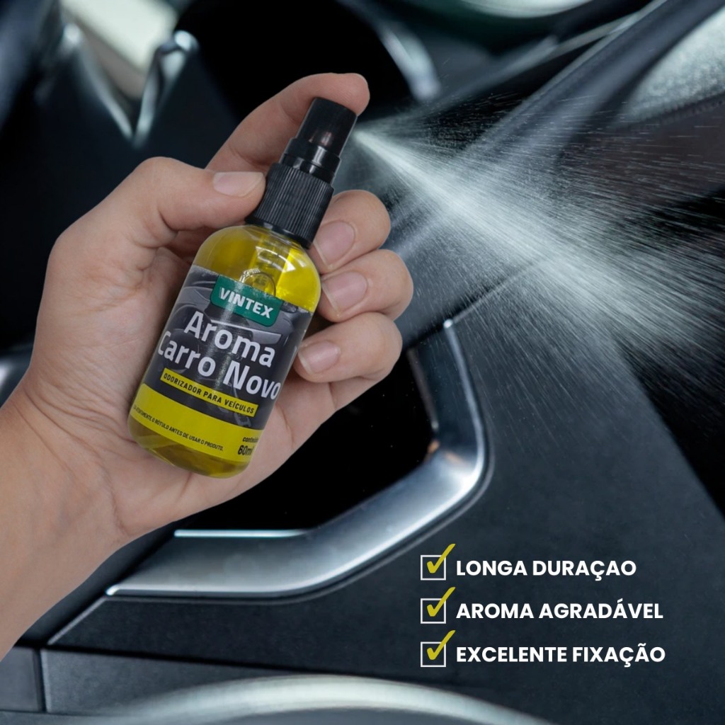 AROMATIZANTE CARRO NOVO Produzido com fragrâncias especiais, o Aroma Spray Carro Novo deixa um agradável odor no interior do seu veículo. Por ser concentrado o produto tem longa duração Tamanho: 60ML -Fragrâncias especiais; -Excelente fixação. Modo de usar: 1.Pulverizar o produto no interior do seu veículo e aguardar alguns segundos.