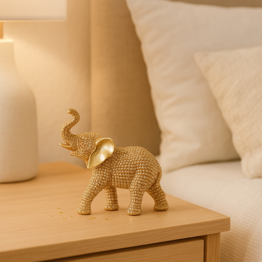 🐘 Arquétipo do Elefante Brilho Dourado – Sorte, Prosperidade, Longevidade e Afasta Negatividade 📏 Tamanhos : 12cm x 11cm (PEQUENO). ou 16cm x 15cm (MÉDIO) NOVIDADE! Material: Resina ✨ Segundo a tradição indiana, colocar um elefante virado de costas para a porta de casa atrai sorte, abundância e proteção. Associado especialmente ao deus Ganesha no hinduísmo, o elefante atrai prosperidade material e oportunidades inesperadas. No Oriente, ele é símbolo sagrado de força, sabedoria e remoção de obstáculos. Ao tê-lo em casa, você ativa qualidades como paciência, resiliência e determinação, criando um ambiente de energia positiva, crescimento, felicidade e altas frequências.
