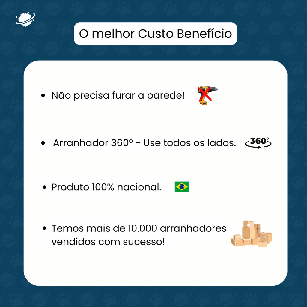 Arranhador de Parede 360º Melhor Custo Benefício!!! Vantagens: - Sem sujeira, não precisa furar a parede, enviamos com uma dupla face super resiste, é só tirar e grudar! - Enriquecimento ambiental para o seu pet. - Sisal de alta qualidade. - Design lindíssimo. O que você irá receber? - Tubo de sisal resistente. - Encaixes da parte de cima e debaixo já com fita dupla face. - Junção de encaixe rápido. É só encaixar, tirar a dupla face e colar!