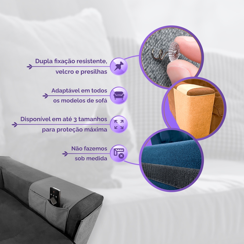 RICAPET - Fabrica de tapete Higiênicos para o seu Pet ***Novo Design, mais fácil de montar, melhor fixação e com suporte para controle remoto. ***FIXADO COM PRESILHAS ASPIRAIS QUE FAZEM ÓTIMA FIXAÇÃO*** O Arranhador de braço de sofá para Gatos, é um produto imprescindível para você e seu gatinho. Sabemos que seu gatinho adora arranhar e com este protetor, seu gatinho irá adorar brincar sem danificar seu sofá. O protetor de sofás e poltronas oferece uma superfície de carpete resistente, reforçado com dupla camada, que irá atrair o gato para afiar suas unhas, deixando o restante do sofá à salvo e reservado apenas para ele se deitar e te fazer companhia. Características: O produto é feito de carpete e suede. Quantidade: 01 unidade (Lado esquerdo de quem esta sentado no sofá) Material: Carpete reforçado Medidas: 50cm X 70cm (Altura x comprimento) Tamanho P- 70cm X 50cm Tamanho M- 100cm X 50cm Tamanho G- 120cm X 50cm Temos nas Cores BEGE / CINZA / AZUL Somos o fabricante do tapete, qualquer pergunta estamos a disposição Especificações Técnicas: Modo de usar: a parte de tecido é colocada sobre o braço do sofá e, em seguida, colocada embaixo da almofada do assento (ou introduzida entre a almofada e a parte interna do braço, quando as almofadas não forem removíveis). A fixação do mesmo por presilhas. ENVIO IMEDIATO. ***MANUAL DE USO ENVIADO JUNTO AO PRODUTO Imagens ilustrativas de uso. Móveis utilizados não fazem parte da oferta do produto. Ricapet - Riqueza é o nosso pet