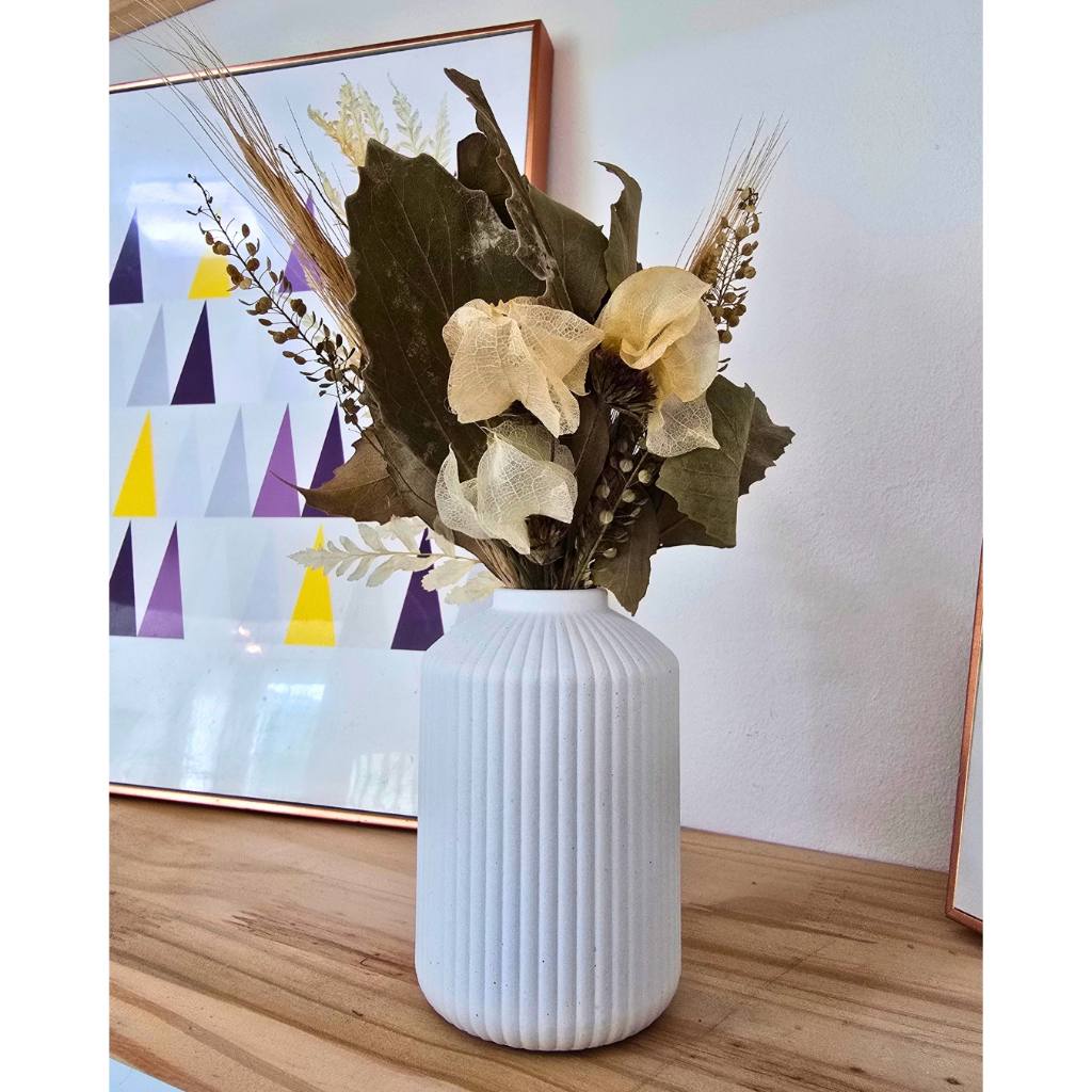 O Arranjo de Flores Secas Decorativo Vaso Garrafa Cilíndrica é uma peça delicada que une charme e estilo em um design compacto e elegante. Feita à mão em cimento, esta garrafa apresenta um acabamento listrado com um estilo de cilindro que adiciona um toque de sofisticação moderna. Perfeita para quem busca uma decoração que combine beleza e funcionalidade, esta mini garrafa adiciona um toque de elegância sutil a qualquer espaço. Informações importantes; Medidas aproximadas apenas da garrafa - 10 x 6,5 cm (Altura x Largura) Medidas aproximadas com o arranjo - 25 x 6,5 cm (Altura x Largura) Composição - Cimento Validade - Indeterminada Conteúdo do envio - 1 Mini Garrafa Cilindro Listrado 10cm em Cimento Artesanal e Flores Secas (enviadas conforme disponibilidade) Mais Informações; É comum que os produtos artesanais apresentem pequenos furos, leves variações de pesos, tonalidade de cor e medidas, pois, se tratam de características do produto, não de uma avaria. Por ser um produto artesanal pode haver variações sutis no tamanho e no peso das peças. Cuidados; Para preservar as características originais e garantir a durabilidade do produto, recomenda-se limpar com um pano seco ou úmido e evitar o uso de produtos químicos ou abrasivos. Evite pancadas ou impactos pois podem trincar, lascar ou danificar o produto. Arranjo de Flores Secas Decorativo Vaso Garrafa Cilíndrica