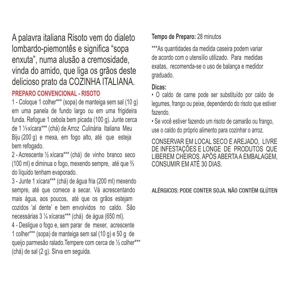 O Arroz Especial para Risoto Meu Biju, como o próprio nome diz, é uma variedade especial para o preparo de risotos, de grão tradicionalmente italiano. Sua enorme capacidade de absorção de líquidos e alta liberação de amido durante o preparo promovem um misto de cremosidade e consistência às receitas. O grão deve sempre ficar “al dente”, pois se muito cozido, pode ficar empapado.Validade: até 12 meses após a data de fabricação.