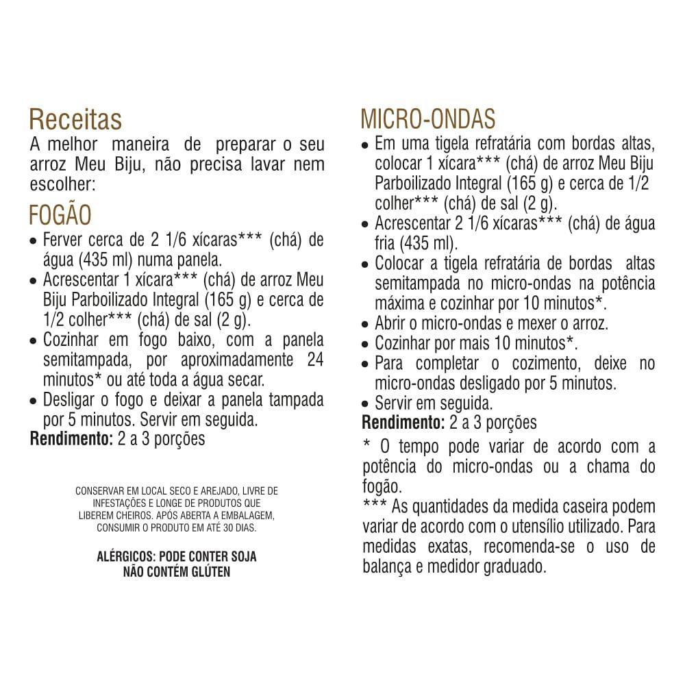 O Arroz Integral Meu Biju passa pelo processo de parboilização e dessa maneira se torna altamente nutritivo, visto que muitos nutrientes do farelo migram para o interior do grão. Por não passar pelo processo normal de polimento, este arroz mantém a camada externa do grão, conservando as suas propriedades.Validade: até 12 meses após a data de fabricação.