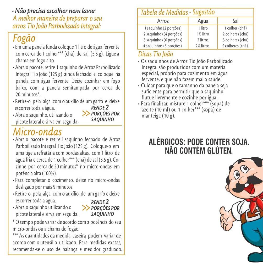 O Arroz Tio João Integral Boil in Bag possui quantidade de fibras maior que o arroz polido. Seu amido é de fácil digestão e fonte de energia para o organismo. Antes de ser descascado, passa por um processo de pré-cozimento, que desloca as vitaminas e minerais para o interior do grão. Este processo estabiliza a camada de farelo e fixa as fibras na parte mais externa do grão, melhorando a conservação e tornando o arroz mais nutritivo que os outros tipos de arroz polido. A opção Boil in Bag é bastante prática e de fácil preparo, pois o arroz cozinha dentro do saquinho, não sujando a panela - cada saquinho rende 2 porções.