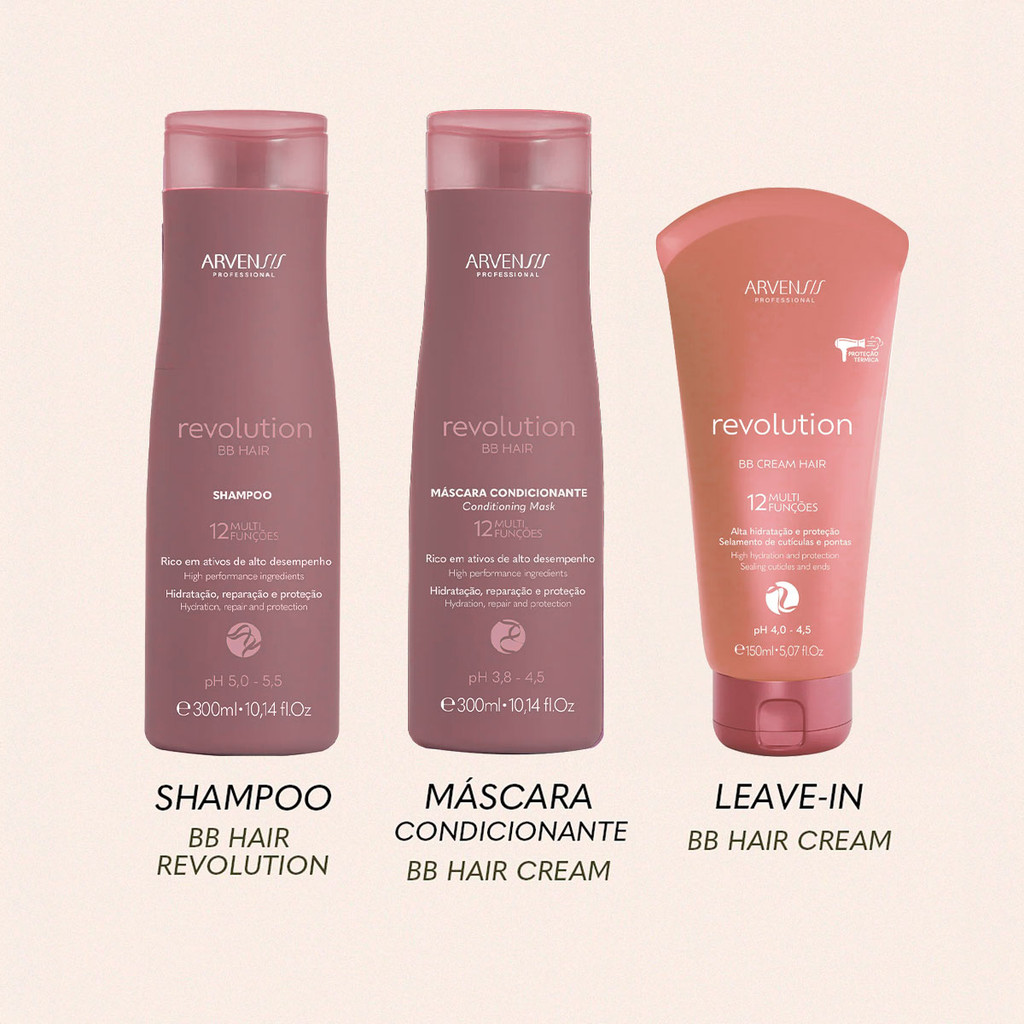 Arvensis Revolution BB Cream Hair - 12 Benefícios em 1 Produto Repara intensamente cabelos ressecados, devolvendo vitalidade e brilho. Com 12 óleos preciosos e vitaminas, nutre profundamente a fibra capilar, recupera a hidratação essencial e sela as cutículas, deixando os fios macios, disciplinados e protegidos contra danos. Conselho de Aplicação Aplique uma pequena quantidade nas palmas das mãos e distribua pelo cabelo limpo e úmido, do comprimento às pontas. Finalize da forma que preferir.
