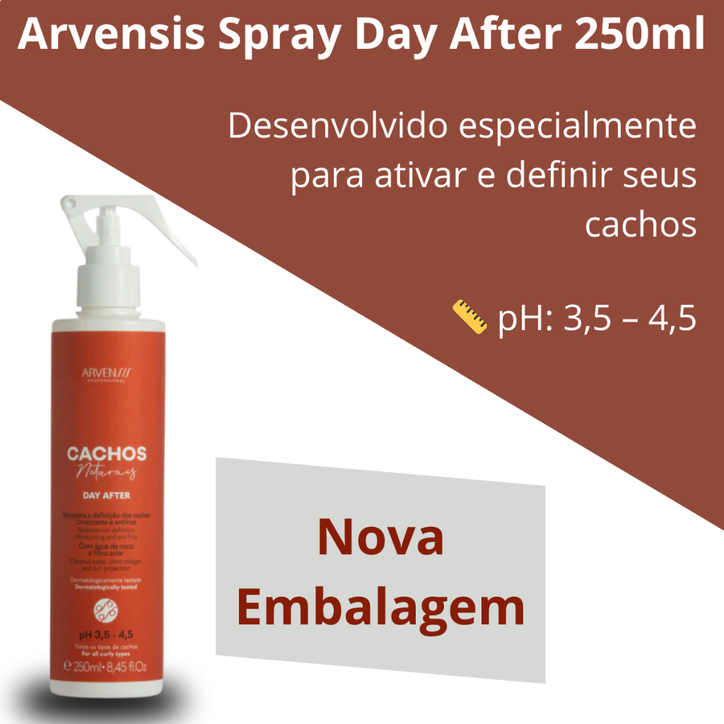 🌟 Arvensis Spray Day After 250ml 🌟 💧 Hidratação, nutrição e definição: Desenvolvido especialmente para ativar e definir seus cachos, deixando-os macios, maleáveis e cheios de brilho. Ideal para todos os tipos de cachos! 🌿 🌱 Principais Ativos: Água de Coco 🥥: Hidratante natural e revitalizante. Colágeno Vegetal: Fortalece e dá mais elasticidade aos fios. Filtro Solar ☀️: Proteção contra os raios UV e envelhecimento precoce. 🔄 Efeito Day After: Acorde com cachos ultradefinidos, sem frizz e com um brilho incrível! 🌟 ✅ Benefícios: Controle do frizz Hidratação e maciez instantânea Proteção contra o sol Cabelos saudáveis e radiantes ✨ 📏 pH: 3,5 – 4,5 para cuidar dos seus cachos com suavidade.