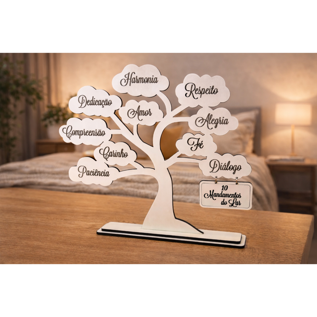 Árvore Decorativa – 10 Mandamentos do Lar em MDF Branco 3mm 🌳 Traga ainda mais significado e harmonia para seu lar com essa linda Árvore dos 10 Mandamentos do Lar, feita em MDF branco 3mm de alta qualidade! 🖼️ Ideal para decoração de salas, quartos, escritórios ou como lembrancinha especial em eventos de família, casamentos, chá de casa nova e muito mais. ✨ Detalhes do Produto: * Material: MDF Branco 3mm * Tamanho: 24cm (largura) x 21cm (altura) x 3cm (base) * Frases inspiradoras como: Amor, Respeito, Compreensão, Fé, Diálogo, entre outras * Base firme e estável – pronta para decorar qualquer cantinho 🎁 Presente perfeito para casais, amigos, familiares ou para você mesmo(a) que ama dar um toque especial à sua casa com mensagens positivas. 🛒 Garanta já a sua Árvore dos Mandamentos do Lar e leve mais amor e valores para o seu ambiente!