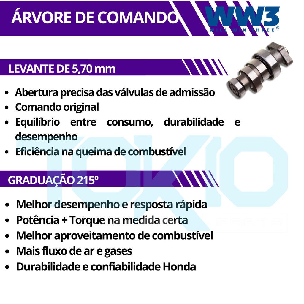 ARVORE COMANDO WW3 CG 160 - BROS 160 - XRE 190- GRADUAÇÃO 215° As árvores de comando WW3 são amplamente reconhecidas no mercado nacional pela sua excelente qualidade e alto desempenho. Fabricadas com materiais de alta resistência e submetidas aos mais avançados processos de tratamento térmico, essas peças garantem precisão nas medidas e eficiência em diferentes faixas de rotação – desde as mais baixas até as mais elevadas. Garanta o melhor desempenho para sua moto com a Árvore de Comando desenvolvida para oferecer precisão, resistência e longa vida útil. Fabricada com materiais de alta qualidade, ela proporciona a abertura e fechamento correto das válvulas, resultando em: Maior desempenho do motor Funcionamento suave e confiável Durabilidade e resistência ao desgaste Substituição perfeita, sem adaptações. COMPATIBILIDADE: HONDA BROS 160 2015 EM DIANTE HONDA CG 160 2015 EM DIANTE XRE 190 2016 EM DIANTE CARACTERÍSTICAS: GRADUAÇÃO: 215° LEVANTE: 5,7mm Fabricado com matéria-prima de alta qualidade; Produto testado e aprovado pelos engenheiros e mecânicos; Matéria prima de alta qualidade o que permite longa vida útil ao produto; Rigoroso controle de qualidade, com alta resistência e máxima durabilidade; OBS: Recomendamos mão de obra especializada ---------------------------------- - Envio no máximo em 24 horas úteis. - Produto 100% original. - Devolução sem custo para o cliente (dentro do prazo de 7 dias ou em caso de garantia).