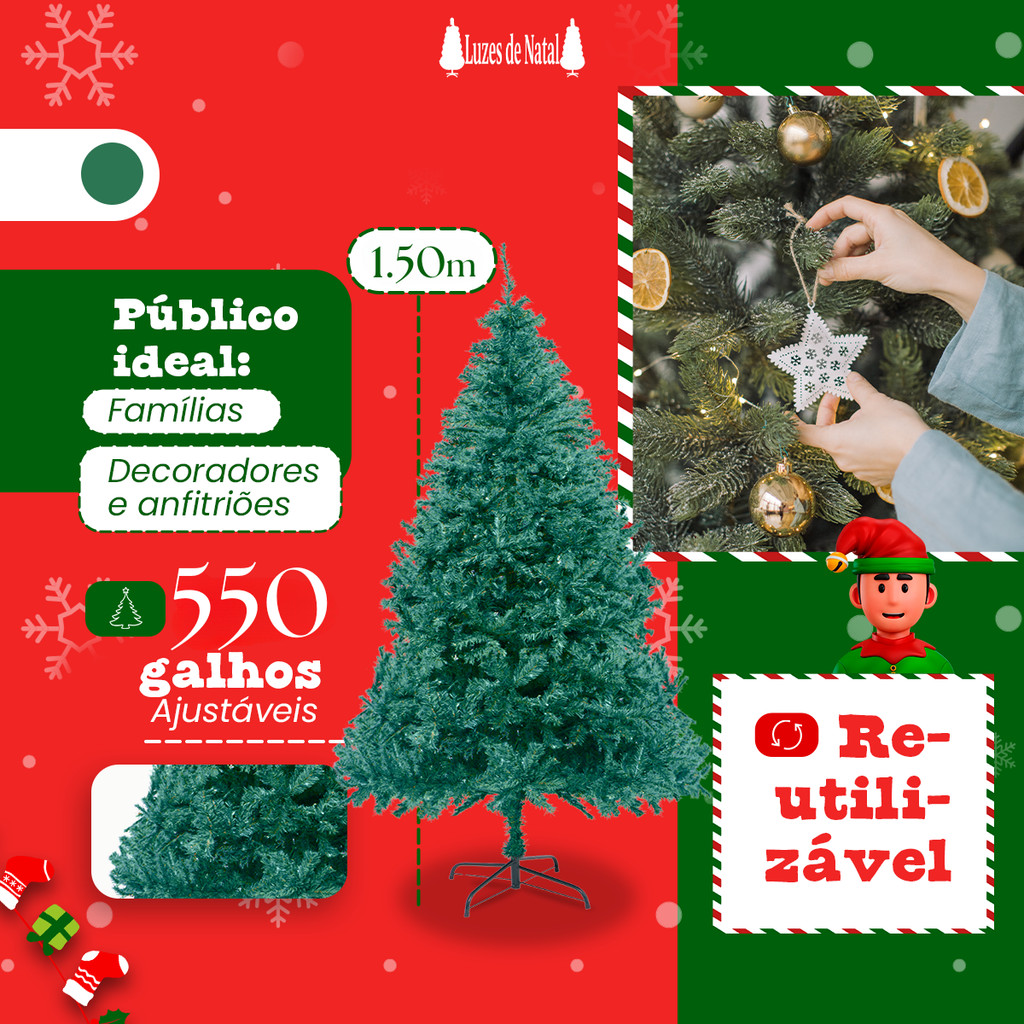 | Árvore De Natal 1,50m 550 Galhos Pinheiro Verde Tradicional este produto | R$ 99,00 | 38% | 4.8/5 | 6 |