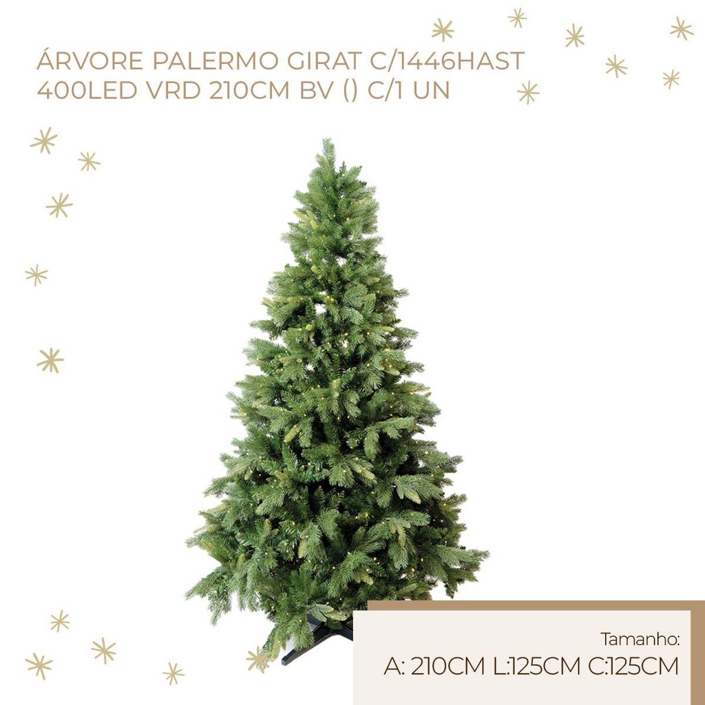 Árvore Palermo com 1211 Hastes e 2260 LEDs 1Un 210x125x125cmDecore seu ambiente com charme e elegância! A Árvore Palermo Giratória da Cromus é perfeita para adicionar um toque de sofisticação à sua decoração. Com 1446 hastes e 400 LEDs verdes, proporciona um brilho suave e aconchegante. Seu design de 210cm de altura com base vermelha traz um contraste harmonioso para qualquer ambiente. Diferenciais:Desenvolvida com materiais de alta qualidade, sendo 80% plástico e 20% metal, garantindo durabilidade e resistência. A tecnologia giratória permite ajustar a posição da árvore de forma prática, facilitando a exposição de todos os seus detalhes. Os LEDs verdes oferecem uma iluminação agradável, criando uma atmosfera acolhedora e festiva. Mais sobre o Produto:Ideal para decorar salas, halls de entrada, escritórios e espaços comerciais. Pode ser usada em eventos especiais, como festas de Natal, conferindo um toque de magia. Fácil de montar e desmontar, possibilitando armazenamento compacto após o uso. Dicas de uso:Para potencializar a decoração, combine a Árvore Palermo Giratória com itens decorativos que sigam a mesma paleta de cores, como bolas de natal vermelhas ou laços verdes. Coloque-a em um local de destaque para que todos possam admirar sua beleza e elegância. Ficha técnica: Título: Árvore Palermo com 1211 Hastes e 2260 LEDs 1Un 210x125x125cmMarca: Cromus Dimensões: 210x125x125cm Quantidade por pacote: 1 unidade Cor: Verde Material: Plástico e Metal