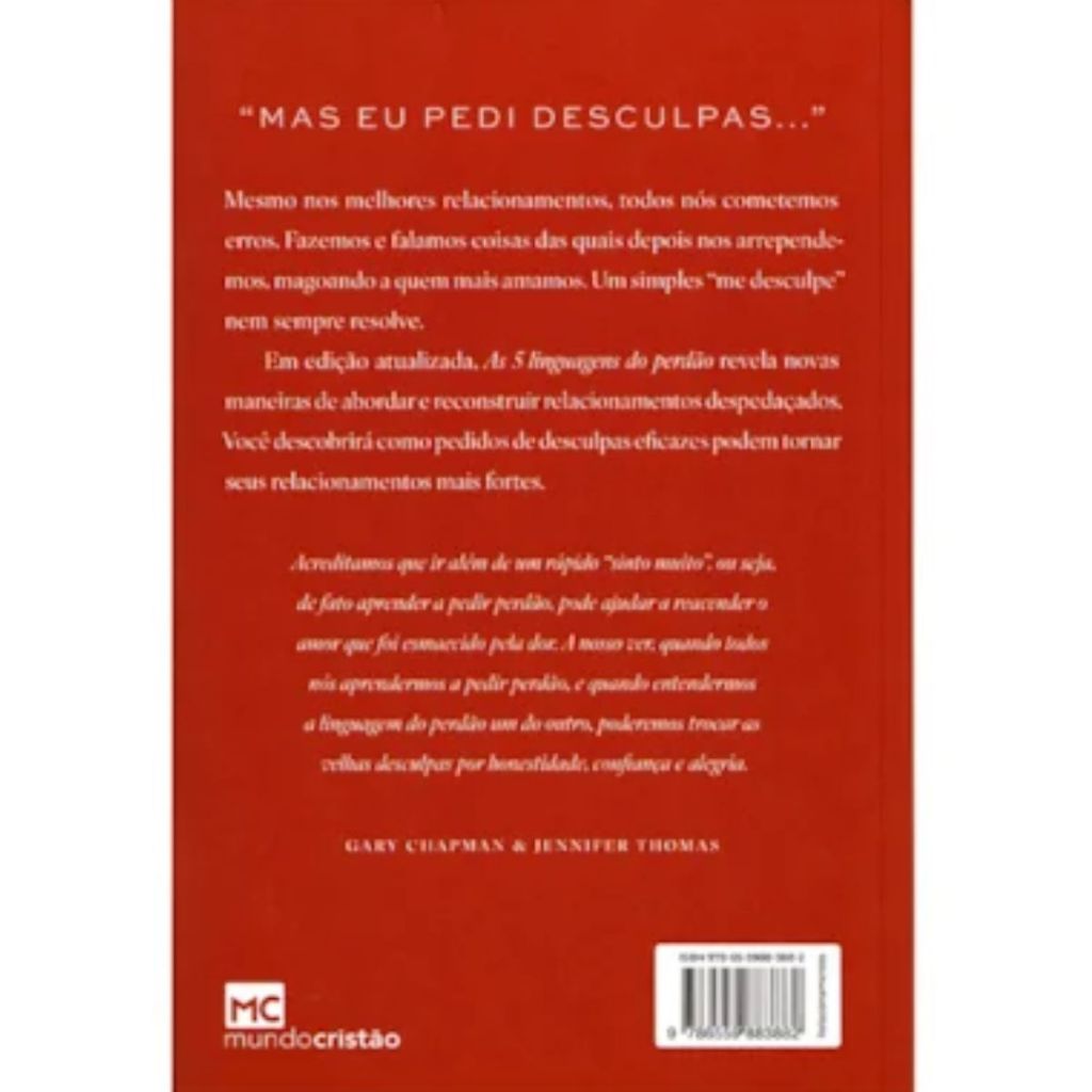 Até nos bons relacionamentos, comentemos erros. Dizemos e fazemos coisas das quais depois sempre nos arrependemos, magoando as pessoas a quem mais amamos. Um simples pedido de “perdão” nem sempre resolve.Neste livro As 5 Linguagens do Perdão apresenta para você novos modos de abordar e reconstruir relacionamentos despedaçados. Você descobrirá como pedidos de desculpas eficazes que podem deixar seus relacionamentos mais fortes.“Acreditamos que ir além de um rápido “sinto muito”, ou seja, de fato aprender a pedir perdão, pode ajudar a reacender o amor que foi esmaecido pela dor. A nosso ver, quando todos nós aprendermos a pedir perdão, e quando entendermos a linguagem do perdão um do outro, poderemos trocar as velhas desculpas por honestidade, confiança e alegria.”Paginas 208