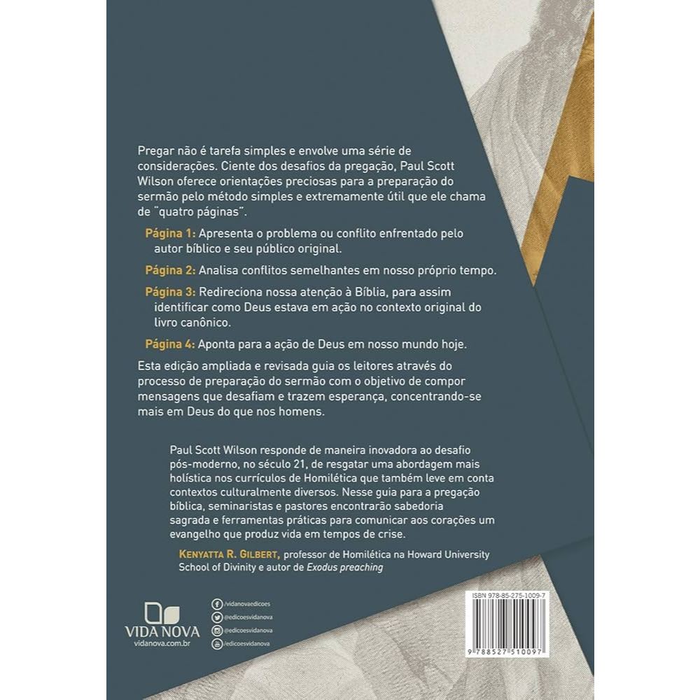 📝 Descrição: As Quatro Páginas do Sermão, de Paul Scott Wilson, é uma obra essencial para quem deseja tornar suas pregações mais bíblicas, relevantes e transformadoras. O autor propõe um método homilético dividido em quatro partes: 1. Página 1: O problema no mundo bíblico 2. Página 2: O problema no mundo atual 3. Página 3: A ação de Deus no mundo bíblico 4. Página 4: A ação de Deus no mundo atual Essa estrutura ajuda o pregador a conectar o texto bíblico com a realidade dos ouvintes, promovendo uma mensagem que seja fiel às Escrituras e impactante para a vida cotidiana. Com linguagem acessível e exemplos práticos, o livro é indicado para pastores, seminaristas, professores e todos que desejam crescer na arte de pregar. 📄 Ficha técnica: Título: As Quatro Páginas do Sermão Autor: Paul Scott Wilson Editora: Vida Nova Ano de publicação: 2021 ISBN: 9788527510097 Idioma: Português Número de páginas: 224 Formato: Brochura Dimensões: 21 cm x 14 cm Peso: 300 g Categoria: Homilética, teologia pastoral, pregação Indicação etária: A partir de 16 anos 🔍 Palavras-chave: quatro páginas do sermão, paul scott wilson, homilética, vida nova, pregação bíblica, estrutura de sermão, teologia pastoral, método de pregação, livro para pastores, ensino bíblico