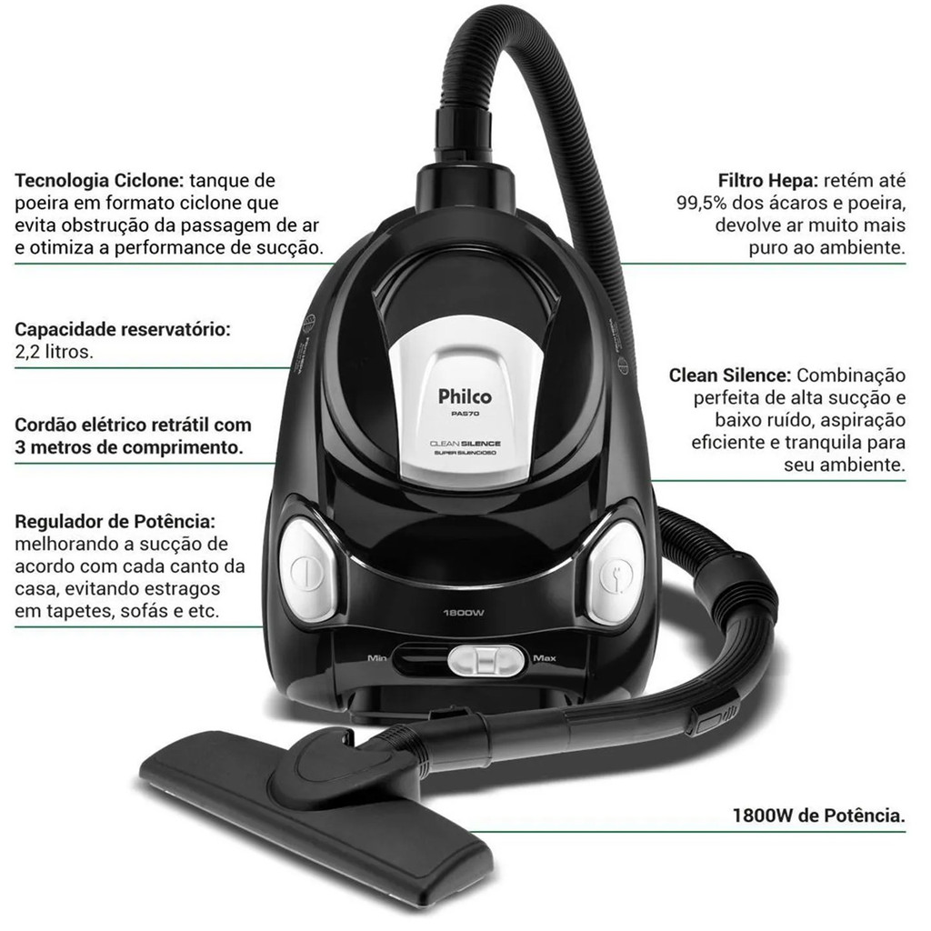 Aspirador de Pó 1800W 2,2 Litros Super Silencioso Tecnologia Ciclone PAS70 Philco