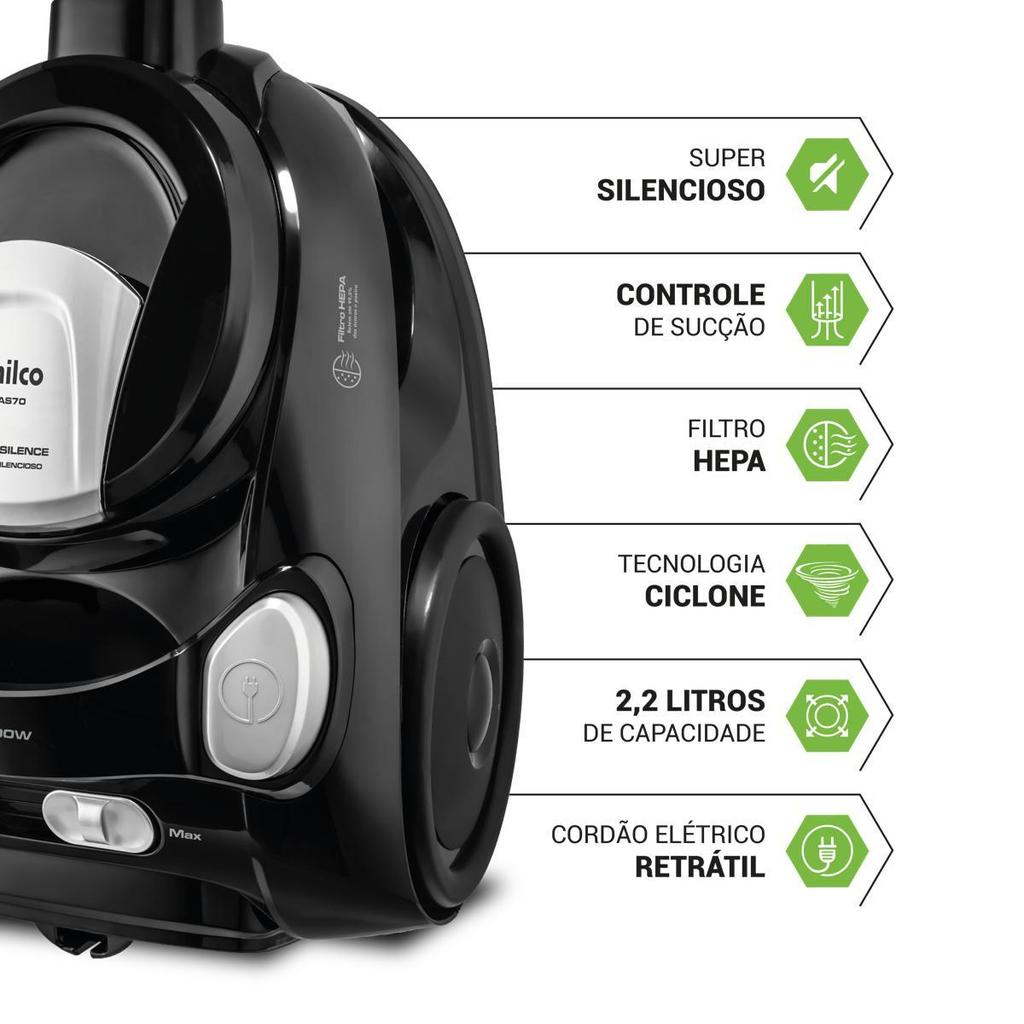 Mais agilidade na hora da limpeza com o Aspirador de Pó Philco 1800W 2,2L Super Silencioso PAS70! São 1800W de alta potência, que garante mais eficiência na hora de aspirar diferentes espaços. Aliado a 2,2L de capacidade, é possível limpar a casa toda sem precisar esvaziar o reservatório de pó com muita frequência. Equipado com a Tecnologia Clean Silence, o Aspirador de Pó Philco PAS70, tem um motor super silencioso, ou seja, a combinação perfeita de alta sucção e baixo ruído, garantindo uma aspiração eficiente e tranquila para seu ambiente! Além disso, o filtro HEPA, retém até 99,5% dos ácaros e poeira, devolvendo um ar mais puro ao ambiente. Retrátil, o cordão elétrico de 3m facilita o manuseio do aparelho e evita as constantes trocas de tomada. Já o regulador de potência melhora a sucção de acordo com cada canto da casa, evitando estragos em tapetes, sofás, etc. Aspirador de Pó Philco 1800W 2,2L Super Silencioso PAS70, prático e versátil, o melhor aspirador para o seu dia a dia! Alta performance de sucção Potência de 1800W Capacidade do Reservatório de 2,2L Alça para Transporte Filtro HEPA, que retém 99% dos ácaros Pedal Liga/Desliga Controle eletrônico de Potência Cordão retrátil, facilita o uso Com compartimento transparente, facilita visualização de reservatório cheio Rodinhas que facilitam a locomoção durante a limpeza Acompanha acessórios para pisos Acessório para limpeza de cantos Acompanha acessório escova para estofados 2 tubos prolongadores Cordão com 3m Motor com TCO.