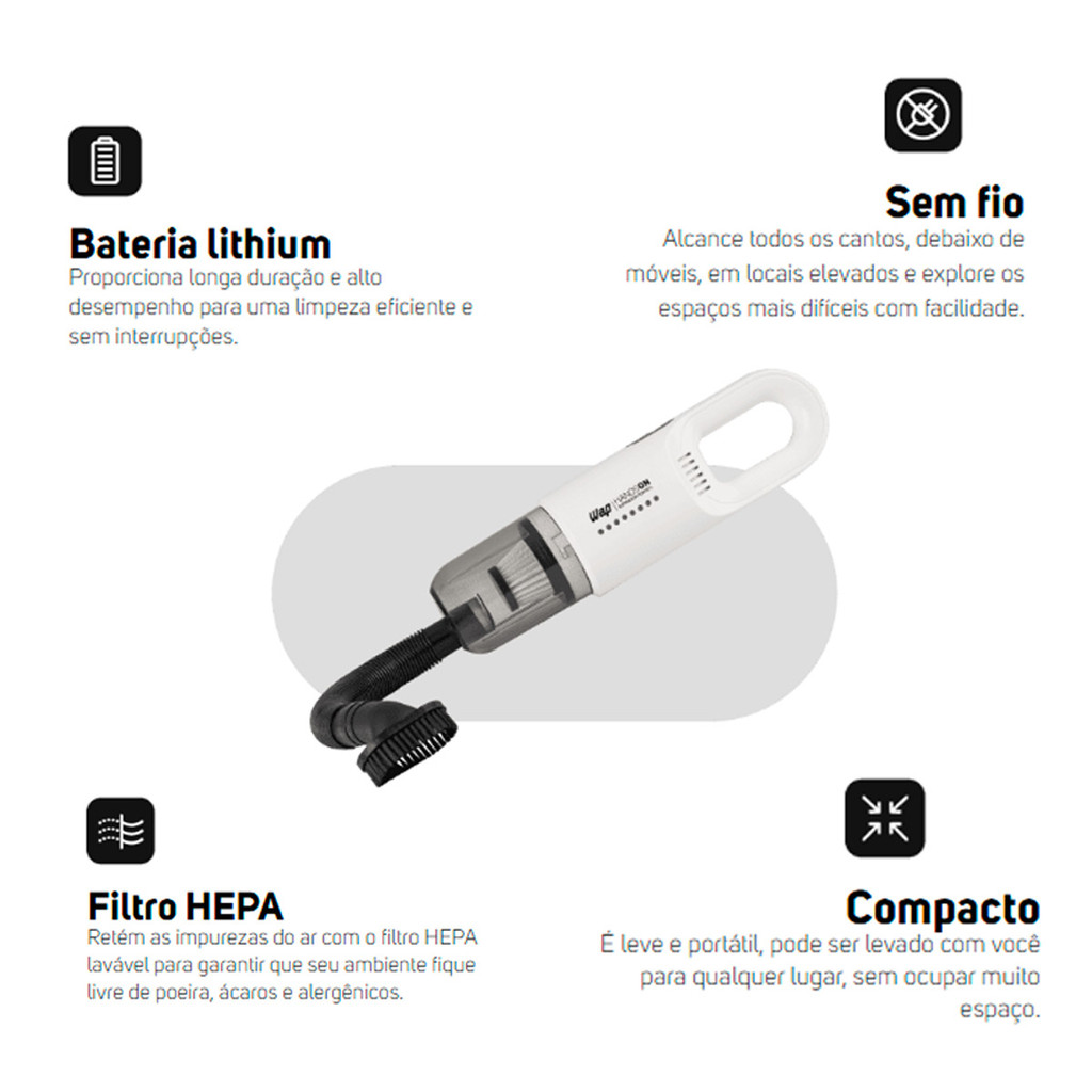 Aspirador de Pó Portátil à Bateria Wap Handson 50W Bivolt Sem Fio Carregamento via Usb Branco - WAP