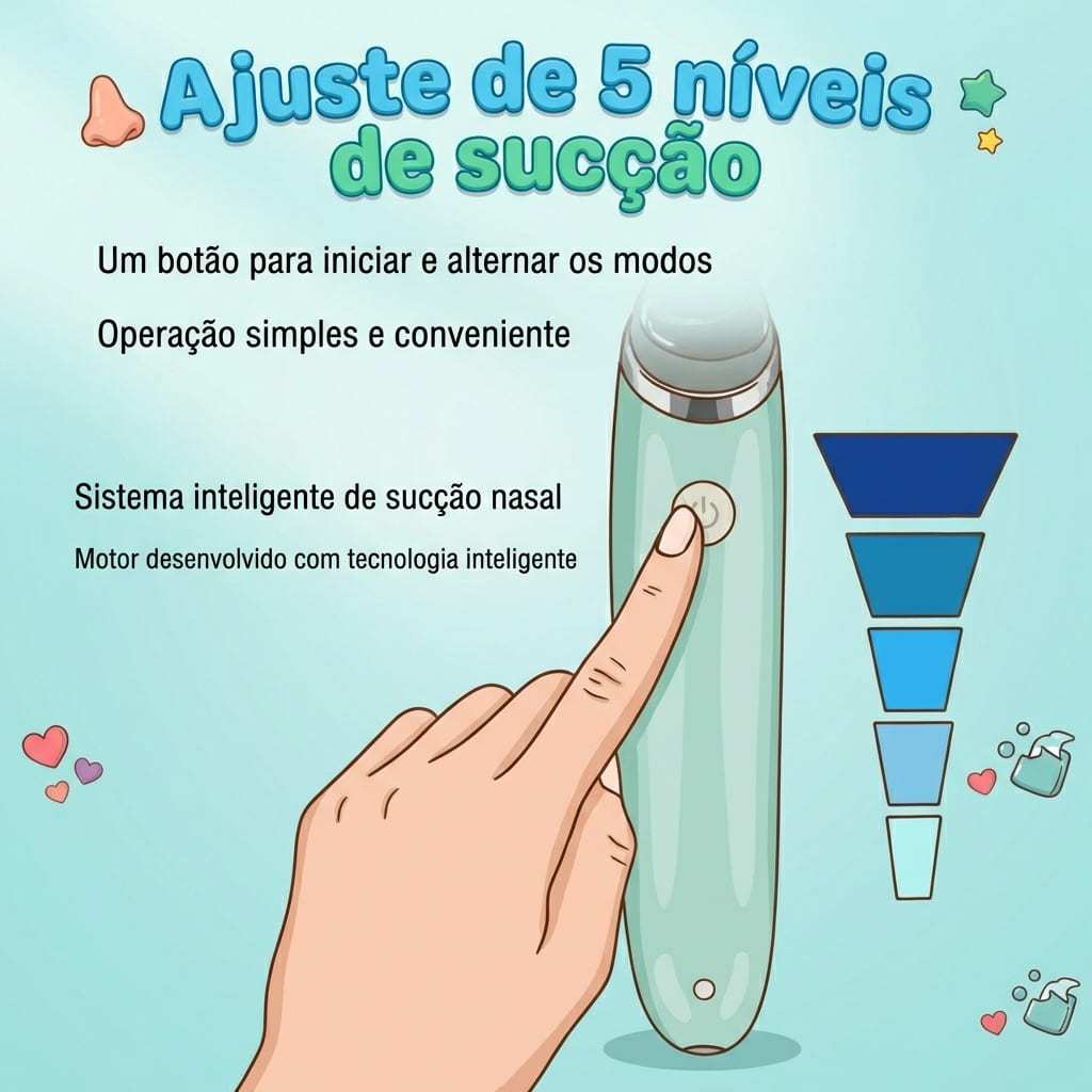 Facilite a respiração do seu bebê com mais segurança, higiene e praticidade. O aspirador nasal elétrico foi desenvolvido para remover secreções de forma suave e eficiente, sem causar desconforto. Com 5 níveis de sucção ajustáveis, você pode escolher a intensidade ideal para cada situação, garantindo uma limpeza eficaz até nos casos de congestão mais intensa. ✔ 5 níveis de sucção ajustáveis – controle total conforme a necessidade ✔ Pontas de silicone macio – seguras e confortáveis para o bebê ✔ 2 bicos diferentes – ideal para diferentes tipos de secreção ✔ Reservatório coletor transparente – fácil de visualizar e limpar ✔ Recarregável via USB (Tipo-C) – mais praticidade no dia a dia ✔ Design ergonômico e portátil – fácil de segurar e transportar ✔ Baixo ruído – não assusta o bebê durante o uso Peças removíveis para limpeza fácil e rápida Material seguro e adequado para uso infantil Sistema que evita retorno de secreção Indicado para uso diário com total segurança