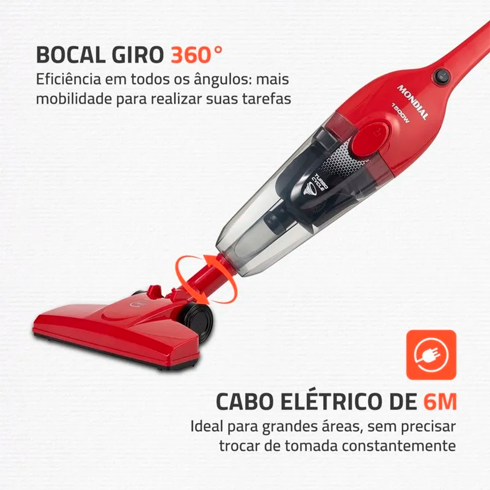 ASPIRADOR VERTICAL MONDIAL TURBO CYCLE AP-40-R 2 EM 1 1500W 220V O Aspirador Vertical Mondial Turbo Cycle AP-40-R é a solução ideal para quem busca praticidade, potência e eficiência na limpeza diária. Com design moderno nas cores vermelho e preto, ele pode ser utilizado como aspirador vertical ou de mão, facilitando a limpeza de pisos, tapetes, estofados e áreas de difícil acesso. Sua potência de 1500W aliada à Tecnologia Turbo Cycle garante alto poder de sucção e melhor separação da poeira, proporcionando resultados mais rápidos e eficientes. O filtro HEPA lavável retém até 99,5% das impurezas, contribuindo para um ambiente mais limpo e saudável. O cabo elétrico de 5 metros amplia o alcance durante o uso, evitando trocas constantes de tomada. CARACTERÍSTICAS PRINCIPAIS - Aspirador 2 em 1 que pode ser utilizado como vertical ou portátil. - Potência de 1500W para alta performance na limpeza. - Tecnologia Turbo Cycle que aumenta o poder de sucção. - Filtro HEPA removível e lavável que retém até 99,5% das impurezas. - Cabo elétrico de 5 metros para maior alcance. - Recipiente coletor de pó com 1,3 litros, fácil de esvaziar e higienizar. - Design moderno, compacto e leve para facilitar o manuseio e o armazenamento. ESPECIFICAÇÕES TÉCNICAS - Marca: Mondial - Modelo: AP-40-R - Tipo: Aspirador vertical 2 em 1 - Potência: 1500W - Tensão: 220V - Filtro: HEPA lavável - Capacidade do coletor: 1,3 litros - Comprimento do cabo: 5 metros - Cor: Vermelho e preto DIMENSÕES DO PRODUTO - Largura: 24 cm - Altura: 108 cm - Profundidade: 17 cm - Peso: 1,8 kg DIMENSÕES DA EMBALAGEM - Largura: 29 cm - Altura: 56 cm - Profundidade: 14 cm - Peso: 2,2 kg ITENS INCLUSOS NA CAIXA - Aspirador Vertical Mondial Turbo Cycle AP-40-R. - Filtro HEPA. - Manual de instruções. GARANTIA - Garantia de 12 meses pelo fabricante.