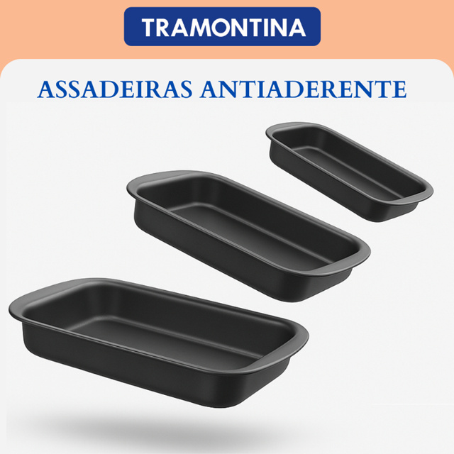 Kit 3 Assadeiras Retangulares Tramontina Antiaderente Leve mais praticidade, qualidade e estilo pra sua cozinha com esse kit incrível da Tramontina! São 3 assadeiras retangulares em tamanhos perfeitos para o dia a dia: Medidas: Grande: 34 cm Média: 28 cm Pequena: 22 cm - Destaques do produto: * Revestimento interno e externo antiaderente Starflon Max – os alimentos não grudam e a limpeza é super fácil *Produzidas em alumínio durável – assam de maneira uniforme *Podem ir ao forno até 230°C *Design moderno, na cor preta, combina com qualquer cozinha *Produto original Tramontina, com qualidade garantida Ideal para preparar bolos, carnes, lasanhas, legumes assados e muito mais! E o melhor: o kit completo ocupa pouco espaço, pois as formas se encaixam facilmente. Aproveite para deixar sua cozinha mais prática com um produto resistente, bonito e funcional! O design retangular das assadeiras não só otimiza o espaço no forno, mas também proporciona uma distribuição uniforme do calor, resultando em pratos perfeitamente assados. Com a Tramontina, você pode confiar na durabilidade e na qualidade dos produtos, tornando cada refeição uma ocasião especial.