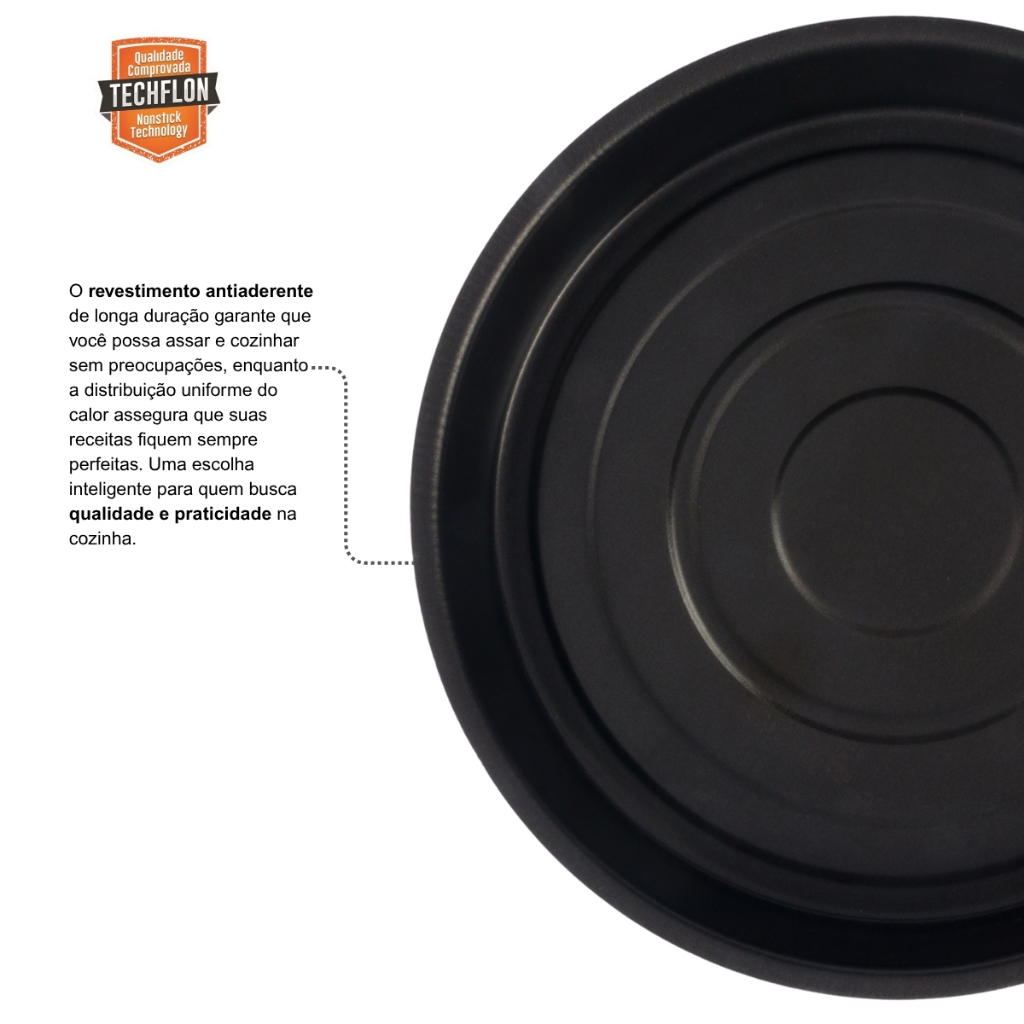 Quer fazer a diferença na apresentação de seus bolos e assados? Então tenha na sua cozinha a Assadeira Redonda Alta, Alumínio Nacional! Produzidas em alumínio com revestimento antiaderente, com a mesma espessura em todo o corpo, garantido um cozimento mais uniforme dos seus alimentos! Informações Adicionais: - Corpo Alumínio com revestimento antiaderente Techflon interno e externo com 5 camadas. - Os alimentos não grudam. - Fácil de limpar. - Design diferenciado e moderno. Uso Seguro e Adequado: Ao utilizar utensílios quentes, tenha cuidado redobrado. Se necessário, utilize proteção para as mãos e mantenha-os fora do alcance das crianças. Para sua maior segurança, ao utilizar utensílios com cabos, mantenha os sempre voltados para o centro do fogão. Instruções De Uso: Os utensílios com antiaderente Techflon terão maior durabilidade se as instruções abaixo forem seguidas. Antes de Usar: Lave interna e externamente o utensílio, usando apenas uma esponja macia, sabão neutro ou detergente líquido. Enxugue bem com um pano seco e unte as partes internas com óleo ou gordura. Leve ao fogo baixo por um ou dois minutos. Deixe a peça esfriar, lave e enxugue. Durante o Uso: Assadeiras antiaderente podem ser aquecidas em altas temperaturas. Pode-se utiliza-la no forno o tempo necessário para preparo de sua receita. Para mexer ou tirar o alimento, use somente utensílios de nylon ou silicone. Nunca corte alimentos diretamente no revestimento antiaderente. Limpeza: Evite a imersão do utensílio quente em água fria. Deixe o utensílio esfriar antes de lavar. Mesmo depois de vários usos nunca utilize produtos abrasivos na lavagem, como saponáceos ou palhas de aço. Se deixar queimar alimentos, deixe seu produto de molho em água durante algum tempo antes de lavá-lo, assim terá a vida útil do produto sempre conservado. Dimensões aproximadas Altura: 6,5cm Diâmetro 32cm Capacidade: 4,1 litros