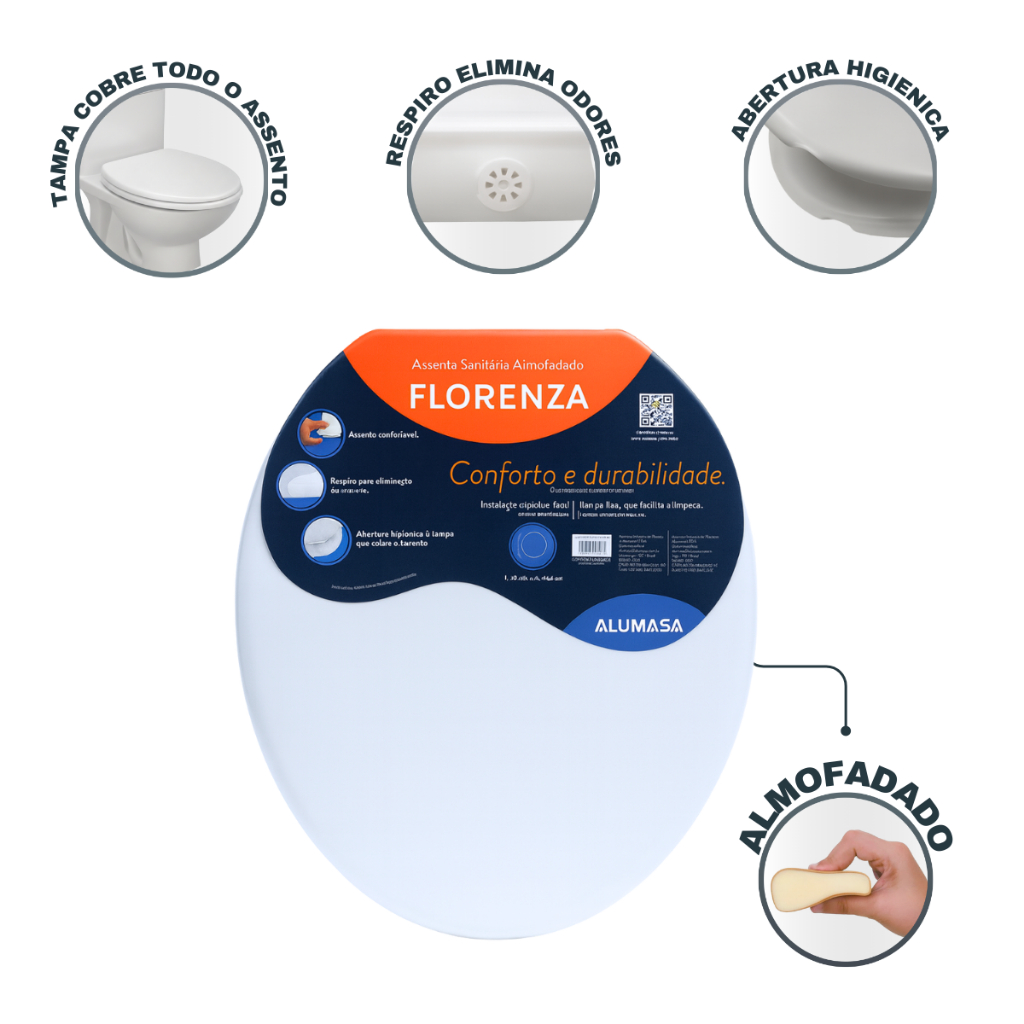 Assento Sanitário Almofadado Universal Oval Florenza – Alumasa Conforto, higiene e durabilidade em um só produto. O Assento Sanitário Almofadado Florenza foi desenvolvido para oferecer máxima comodidade, fácil instalação e um design moderno que combina com qualquer banheiro. Produzido com materiais de alta qualidade (Polipropileno, EVA e Poliuretano), ele conta com textura fosca, acabamento impecável e tecnologia de respiro para eliminar odores, mantendo o ambiente mais agradável. Sua superfície lisa evita o acúmulo de sujeira, facilitando a limpeza no dia a dia. Além de bonito e resistente, É universal para vasos ovais. Compatível com marcas como: -Incepa -Celite -Deca -Icasa -Logasa -Ideal -Standard -Roca -Santa Clara -Fiori -entre outras. --------------------------------- Especificações Técnicas: Disponivel nas Cores: Branco,Preto, Cinza e Areia Marca: Alumasa Modelo: Florenza Tipo: Assento sanitário almofadado Material: Polipropileno, EVA e Poliuretano Altura (fechado): 2,9 cm Largura: 37,7 cm Comprimento: 44,4 cm Compatibilidade: Universal para vasos ovais --------------------------------- Instalação rápida em 3 passos: Retire os parafusos do conjunto de fixação. Posicione nos orifícios traseiros da tampa. Rosqueie as porcas até fixar firmemente. Ideal para quem busca conforto, praticidade e um visual moderno no banheiro.