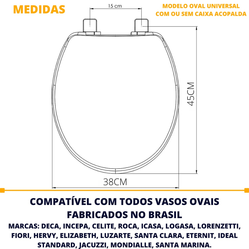 Olá, Bem vindo a Distribuidora Brester. Trabalhamos com uma grande variedade de ferramentas elétricas e manuais, descartáveis, eletroeletrônicos, artigos para casa, artigos de petshop e outros. Aqui você encontrará Produtos Originais, Nota Fiscal, Pronta Entrega e Envio Imediato! * Características do produto * Assento Sanitário Oval Universal Soft Metasul O melhor assento do mercado. Resistente, confortável, evita cheiro, fácil instalação. O melhor CUSTO x BENEFÍCIO. Confira abaixo os benefícios: - Ideal para vaso oval - Universal - Produto de Qualidade. - Possuem regulagem nos parafusos de fixação para se ajustar ao seu vaso - Tampa com cobertura total do assento com Assento e Tampa lisos que facilitam a limpeza - Formato gota com Local de 'pega' que evitam contato com a bacia sanitária - Respiro para eliminação de ar posicionado adequadamente para evitar contaminação e mau cheiro - Acabamento liso e brilhante deixando o visual do produto mais clean. - Quando fechado reduz o barulho provocado pela descarga. INFORMAÇÕES DO PRODUTO: > Marca: Metasul > Modelo: Soft > Modelo: Oval universal > Material da base: Soprada em polietileno > Material da tampa: Polietileno injetado (plástico) de alto brilho > Fechamento: Convencional. > Fixadores: Polipropileno (plástico). DIMENSÕES: > 5 x 43 x 35cm Compatível com os Modelos: > Deca > Icasa > Logasa > Incepa >Roca > Celite > Ideal standart > Fiori MODO DE INSTALAÇÃO: 1. Destaque os parafusos que se encontram junto com o conjunto de fixação. 2. Posicione os parafusos nos orifícios do Vaso Sanitário. Utiliza o encaixe dos parafusos no assento para frente ou para fora, para obter a cobertura ideal no vaso sanitário. 3. Instale uma porca em cada parafuso rosqueando até fixar bem. DÚVIDAS FREQUENTES Os produtos são novos? Sim, todos os nossos produtos são novos. Os produtos possuem nota fiscal tanto para pessoa física quanto para pessoa jurídica? Sim, todos nossos produtos possuem nota fiscal. Os produtos possuem garantia? Sim, todos nossos produtos possuem garantia de fábrica. Posso realizar a troca de endereço após a compra? Não, não é possível alterar o endereço após a finalização da compra, por isso é importante sempre deixar seus dados atualizados. Posso alterar a quantidade ou o produto após a compra? Após a aprovação do pagamento, não é mais possível alterar o produto ou a quantidade. Consigo comprar mais de um item com o mesmo frete? Sim. Nesse caso é só utilizar o carrinho de compras. Obrigado por escolher a Distribuidora Brester.