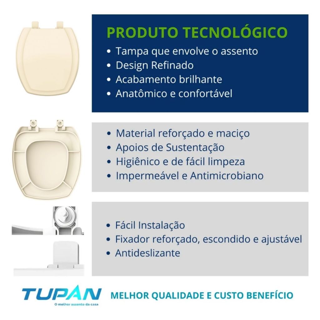 Assento sanitário com sistema de fechamento convencional compatível com a louça sanitária Thema (Incepa). Confeccionado em polipropileno injetado, esta tampa sanitária é higiênica e de fácil limpeza. Este modelo é muito confortável, resistente, possui tampa envolvente e superfície brilhante. Este assento sanitário oferece o melhor custo-benefício do mercado, sua estrutura é sólida e muito resistente, possui fixadores ajustáveis e anti deslizantes. Descrição: Código: THPPE57C Cor: biscuit. Material: polipropileno injetado (plástico). Tipo de assento: específico. Fechamento: convencional. Superfície lisa: sim. Fixação ajustável e anti deslizante. Tipo de fixação: parafuso. Ferragens: polipropileno (plástico). Acabamento das ferragens: nylon (não enferruja oferecendo maior durabilidade a peça). Indicado para a bacia sanitária: Thema. Marca recomenda para uso: Incepa. Manual: evl p-plus. Fabricante: Tupan. Medidas do assento sanitário: Altura: 4 cm Largura: 40 cm Comprimento: 43 cm Medidas da louça sanitária: Largura: 40 cm Comprimento: 43 Distância entre os furos de fixação: 15 cm Acompanha manual e componentes para fixação. Recomendações de uso, manutenção e limpeza: Usar somente água e sabão neutro com um pano macio, pois alguns produtos de limpeza podem danificar o assento. Informações complementares: Não subir ou sentar na tampa do assento. Produto com 12 meses de garantia contra defeitos de fabricação.