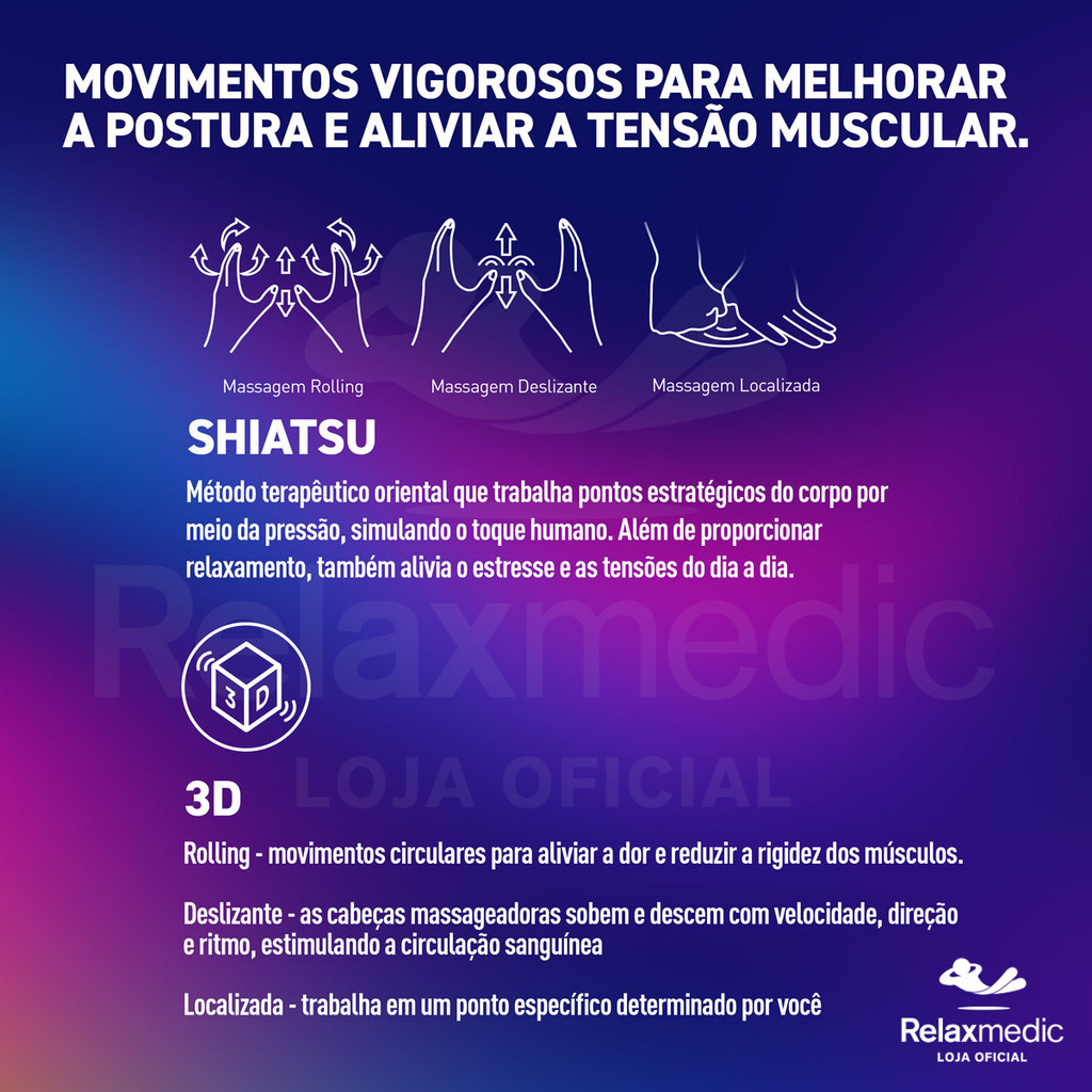 PRONTA ENTREGA | TODAS AS FOTOS SÃO REAIS DO PRODUTO | ENVIO PARA TODO BRASIL | MAIS DE 20 ANOS NO MERCADO | 1 ANO DE GARANTIA | ASSISTÊNCIA TÉCNICA PRÓPRIA Que tal tirar 15 minutos do seu dia para um momento de descanso e bem-estar? O Assento Neck & Back Shiatsu Seat Plus da Relaxmedic proporciona relaxamento completo para pescoço, costas e pernas. Você terá a sensação de estar nas mãos de um massagista profissional, sem sair de casa, a hora que desejar! O nosso Assento Massageador possui três técnicas na massagem Shiatsu, são elas: rolling, deslizante e localizada, que juntas proporcionam uma experiência completa de descontração e relaxamento. Os mecanismos massageadores deslizam com pressão constante e realizam movimentos para cima e para baixo, proporcionando alívio de dor, sensação de bem estar e redução do estresse. Possui função 3D em que os massageadores atuam de maneira tridimensional, destacando-se em altura, profundidade e largura. Assim, intensifica ainda mais a vivência da massagem, transmitindo a real sensação de estar nas mãos de um profissional. O AQUECIMENTO no pescoço e nas costas estimula a circulação sanguínea e potencializa a sensação de relaxamento. O ASSENTO VIBRATÓRIO proporciona relaxamento imediato e possui acabamento premium em courino, luz LED indicativa de funcionamento e de aquecimento, além de cintas para fixar na cadeira, poltrona ou sofá. A capa do encosto de pescoço é removível e lavável. Facilmente adaptável a diferentes estaturas, o assento conta com ajuste de altura para massagem Shiatsu no pescoço. Quando desejar enfatizar algum ponto específico, é possível regular o posicionamento dos mecanismos das costas, personalizando o massageador exclusivamente para você. Tenha um momento relax só seu com o Assento Neck & Back Shiatsu Seat Plus da Relaxmedic! FAQ: PERGUNTAS FREQUENTES SOBRE O ASSENTO NECK & BACK SHIATSU SEAT PLUS - A MASSAGEM ALCANÇA A REGIÃO LOMBAR? Sim, alcança. Os massageadores percorrem toda a região das costas. - PODE USAR QUANTOS MINUTOS POR DIA? Recomendamos o uso diário de 15 minutos. - É POSSÍVEL ADAPTAR O USO DO MASSAGEADOR A PESSOAS COM ESTATURAS DIFERENTES? Sim, com o ajuste de altura do pescoço, você consegue adequar em uma posição confortável de acordo com a sua estatura. - PODE FAZER A MASSAGEM DEITADO, COM O APARELHO TOTALMENTE NA HORIZONTAL? Recomendados somente utilizar o Assento Massageador Neck & Back Shiatsu Seat Plus sentado em poltronas, cadeiras ou sofás. - O MASSAGEADOR TEM AJUSTE DE INTENSIDADE? Não possui ajuste de intensidade. - PODE UTILIZAR NO BANCO DO CARRO? O Assento Massageador Neck & Back Shiatsu Seat Plus não é indicado para usar em veículos por ser muito grande e não acompanhar adaptador para carro. - PODE FICAR SENTADO VÁRIAS HORAS NO ASSENTO NECK & BACK SHIATSU SEAT PLUS, MESMO COM A MASSAGEM DESLIGADA? Sim, mas pode acontecer que, após tantas horas sentado sobre o massageador, gere algum incômodo ou desconforto por conta dos motores de massagem que ficam em relevo no assento. Nesse caso, indicamos os produtos da nossa linha de ortopédicos que são mais apropriados. - QUAL A VOLTAGEM DO ASSENTO NECK & BACK SHIATSU SEAT PLUS? É Bivolt. Pode ser utilizado tanto na voltagem 110V, quanto no 220V. - QUEM É O FABRICANTE? A marca é Relaxmedic. - TEM GARANTIA? Sim! 1 ano de garantia e a marca possui assistência técnica própria, o que facilita o suporte do cliente mesmo que o produto já esteja fora da garantia. - O MANUAL É EM PORTUGUÊS OU INGLÊS? Manual completamente em português. - O PRODUTO É ORIGINAL? Sim! Nós somos a loja oficial da Relaxmedic. FICHA TÉCNICA NOME DO PRODUTO: Neck & Back Shiatsu Seat Plus MARCA: Relaxmedic MODELO: RM-AS8187A DIMENSÕES: 78 x 42 x 42 cm (10cm de espessura) POTÊNCIA: 48 W FREQUÊNCIA: 60 Hz ALIMENTAÇÃO: Bivolt CONSUMO DE ENERGIA: 0,36 kWh/mês (uso diário de 15 minutos) PESO: 6,2 kg GARANTIA: 1 ano SOBRE A RELAXMEDIC Estamos no mercado há mais de 20 anos, trazendo sempre inovações e tecnologia para tornar o dia a dia do brasileiro mais confortável, saudável e tranquilo. Temos a preocupação com o meio ambiente e, por isso, juntos ao projeto EU RECICLO, a cada 1 embalagem vendida uma outra embalagem é reciclada. Além do nosso time no Brasil, temos uma equipe internacional que faz a curadoria de produtos e garante, em inspeções e testes rigorosos, a qualidade de todos os produtos antes de chegarem ao nosso país, sempre respeitando nossa legislação e as certificações Anvisa, Inmetro e Anatel.