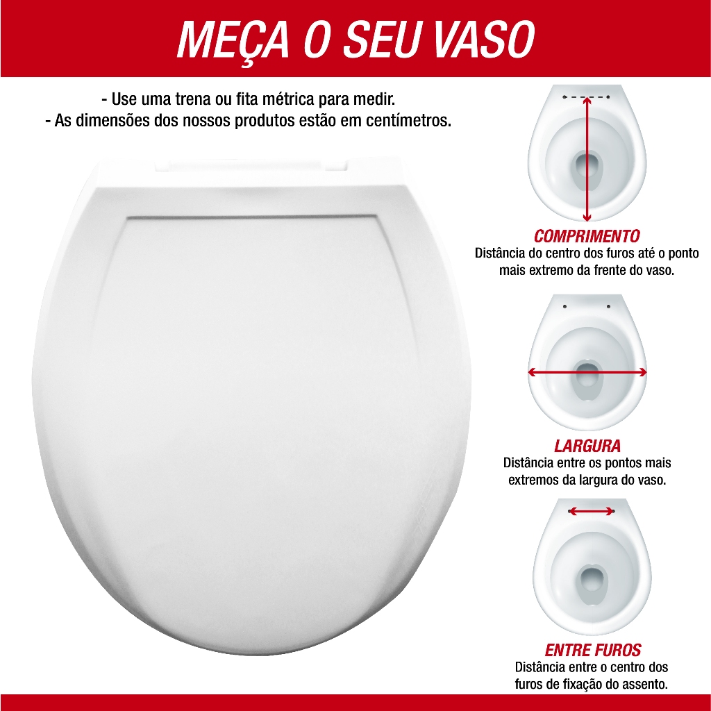 ATENÇÃO: Meça sua louça sanitária conforme instruções na imagem do produto para conferir a compatibilidade do assento. A qualidade Mebuki agora na internet! O Assento Sanitário Almofadado Oval Universal Mebuki é resistente, confortável e de fácil instalação. Conheça os detalhes que fazem a diferença no nosso produto: A tampa e o assento não caem, mesmo com louças que possuem caixa acoplada. Parafusos de fixação ajustáveis e reforçados, acompanhados de porcas cônicas, que garantem um melhor ajuste para seu vaso. Tampa envolvente que cobre todo o assento Rebaixo higiênico para facilitar o manuseio. Assento almofadado com Poliuretano de qualidade, que evita que a espuma se deteriore com o tempo. Respiro traseiro, posicionado adequadamente para evitar mau cheiro e acúmulo de germes no interior do assento. Disponível em diversas cores. Compatível com TODAS louças sanitárias ovais convencionais do mercado. Distância entre parafusos: Mínima: 15 cm / máxima: 16,5 cm Medidas (LxCxA): 39x44x3 CONTÉM: 1 Assento Sanitário Oval com Tampa 1 kit Fixação