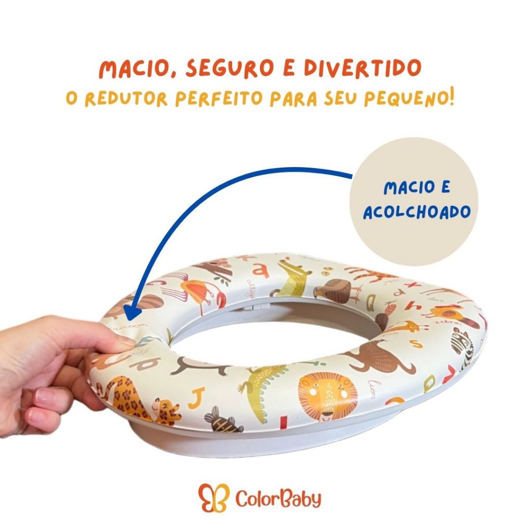Assento Redutor Infantil para Vaso Sanitário Macio Antiderrapante Estampado - Desfralde Criança - ColorBaby Transforme o momento do desfralde em uma experiência tranquila, segura e divertida com o nosso Assento Redutor Infantil! Com base anti escorregões, superfície macia e estampas encantadoras, é o item ideal para incentivar a autonomia da criança e dar mais tranquilidade aos pais! 📝 DESTAQUES: • Estampas divertidas e coloridas que encantam as crianças. • Assento acolchoado para máximo conforto. • Base com encaixe que garante segurança e evita escorregões. • Compatível com a maioria dos vasos sanitários. • Fácil de limpar e transportar. 🔹 BENEFÍCIOS: • Mais segurança: encaixe inferior firme, que evita movimentos durante o uso. • Mais conforto: espuma acolchoada que não incomoda mesmo em usos prolongados. • Mais autonomia: incentiva o uso do vaso de forma independente • Mais praticidade: leve, portátil e fácil de higienizar. • Mais aceitação: design atrativo e lúdico, ideal para crianças em fase de adaptação. 🏡 RECOMENDAÇÕES: • Recomendado sempre com supervisão de um adulto durante o uso. •Para limpeza, utilize pano úmido e sabão neutro. ⚙️ ESPECIFICAÇÕES TÉCNICAS Material: Polipropileno (PP), Poliuretano (PU) e Policloreto de Vinila (PVC) Cores: Branco Zoológico, Branco Elefante, Azul Bola e Rosa Gato Tamanho (LxCxA): Aproximadamente 27,5cm X 29,5cm X 6cm Peso: 0,24kg 📦 CONTEÚDO DA CAIXA: • 1 Assento Redutor Infantil Estampado para Vaso Sanitário ColorBaby Atenção: A cor do produto pode variar de acordo com as configurações do seu aparelho, contraste e iluminação do ambiente. 🎁 Ótima opção para presentear você e o seu pequeno! 👶 📌 Garanta já o seu! Clique em COMPRAR agora e aproveite! 🛒