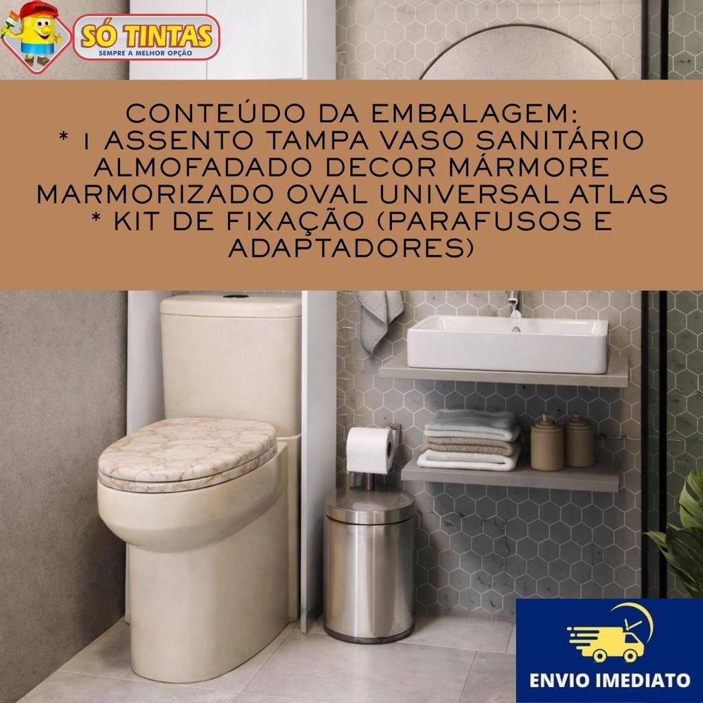 Assento Tampa Vaso Sanitário Almofadado Decor Mármore Marmorizado Oval Universal Atlas O Assento Tampa Vaso Sanitário Almofadado Decor Mármore Marmorizado Oval Universal Atlas une design moderno e conforto superior, proporcionando um acabamento elegante ao banheiro sem abrir mão de funcionalidade e durabilidade. Ideal para quem busca um produto confortável, fácil de limpar e com visual diferenciado que combina com diversos estilos de decoração. Principais Benefícios * Assento almofadado com superfície macia, proporcionando maior conforto no uso diário * Acabamento com estampa decorativa tipo mármore/marmorizado que valoriza o ambiente * Design oval universal, compatível com a maioria dos vasos sanitários padrão * Estrutura resistente e durável, feita em plástico de alta qualidade * Superfície fácil de higienizar, mantendo o banheiro sempre limpo * Instalação rápida e prática com kit de fixação incluso Especificações Técnicas Marca: Atlas Modelo: Decor Mármore Marmorizado Tipo: Assento sanitário com tampa almofadada Material: Plástico resistente com revestimento superior acolchoado Formato: Oval universal Cor/Estampa: Mármore marmorizado (variação decorativa) Fixação: Parafusos ajustáveis inclusos Compatibilidade Compatível com a maioria dos vasos sanitários ovais padrão. Não indicado para vasos sanitários quadrados ou formatos especiais. Recomenda-se comparar as medidas do vaso antes da compra para garantir compatibilidade. Medidas Aproximadas * Comprimento (borda mais longa): ~44 cm * Largura (borda mais curta): ~37 cm * Altura (espessura do assento almofadado): ~3,5 cm a 4 cm Peso Aproximado * Aproximadamente 700 g a 800 g (variação conforme acabamento e materiais) Limpeza e Conservação * Limpar com pano macio e sabão neutro * Não usar produtos abrasivos ou químicos agressivos * Após a limpeza, manter o assento seco para maior durabilidade Perguntas Frequentes (FAQ) Serve em qualquer vaso sanitário? Sim, este assento é universal oval, compatível com a maioria dos vasos sanitários ovais padrão. É fácil de instalar? Sim. O produto já acompanha o kit de fixação e pode ser instalado rapidamente sem ferramenta especial. A superfície almofadada desgasta com facilidade? Não. O revestimento é feito com materiais resistentes e projetado para uso diário, com boa durabilidade quando limpo corretamente. Combina com banheiros modernos? Sim. O acabamento marmorizado agrega sofisticação e valoriza diferentes estilos de decoração. O produto possui garantia? A garantia segue as normas da marca Atlas — detalhes podem ser vistos no manual de instruções incluso. Conteúdo da Embalagem * 1 Assento Tampa Vaso Sanitário Almofadado Decor Mármore Marmorizado Oval Universal Atlas * Kit de fixação (parafusos e adaptadores)