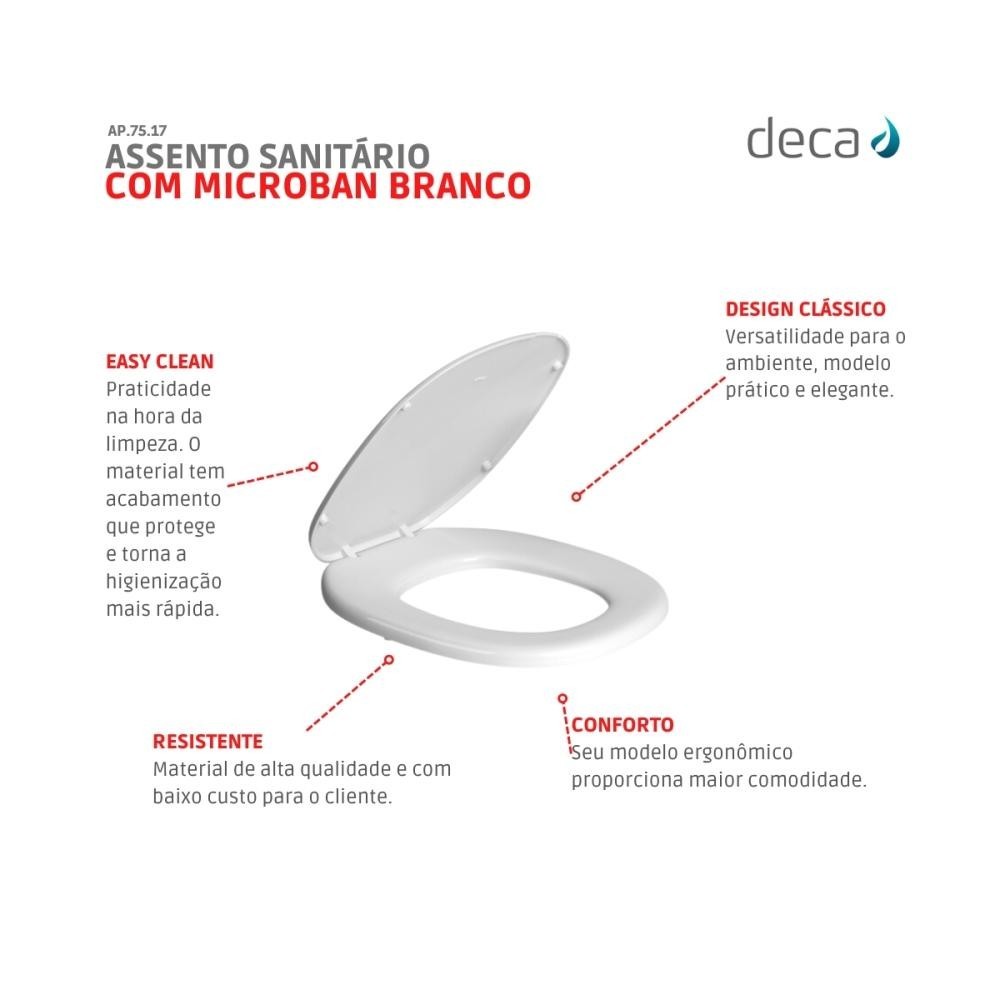 SOBRE O PRODUTO O Assento Higiênico Aspen e Fast Fechamento Comum Deca é um produto de elevada qualidade e comodidade para sanitários. Produzido pela prestigiada empresa brasileira Deca, apresenta um design ergonômico que assegura conforto durante a utilização. Com altura de 5,5cm ao ser fechado, suas dimensões de 37cm de largura por 45cm de comprimento são relevantes para garantir compatibilidade com a bacia. Feito de polipropileno, é resistente e perfeito para uso prolongado em lavabos públicos, suítes residenciais e estabelecimentos comerciais. A tonalidade branca contribui para um ambiente bem iluminado e com sensação de limpeza, além de disfarçar possíveis riscos. A higienização é simples, utilizando apenas sabão neutro e um pano umedecido, podendo-se usar uma escova com cerdas suaves. DIFERENCIAIS - Adaptação a diferentes modelos de vasos sanitários. - Fácil instalação. - Sistema de fixação ajustável. - Acabamento branco brilhante, fácil de limpar. - Modelos com sistema de fechamento suave. INFORMAÇOES TECNICAS - Produto: Assento Sanitário - Tipo: Convencional - Cor do Assento Sanitário: Branco - Formato: Quadrado - Almofadado: Não - Tipo de Fechamento: Fechamento Comum - Acompanha Fixação: Sim - Quantidade de Peças de Fixação: 2 peças - Tipo de Fixação: Parafuso DIMENSÕES - Altura: 5,5cm - Largura: 37cm - Comprimento: 45cm CONTEUDO DA EMBALAGEM - Assento sanitário - Manual de instalação GARANTIA 12 meses (para defeitos de fabricação). SOBRE O FABRICANTE Transformar os espaços em ambientes únicos e inspiradores para ver e viver, onde forma e função estejam em total sinergia para trazer mais bem-estar, impacto positivo e cuidado na vida das pessoas. Deca combina design, inovação, qualidade e sustentabilidade que fazem da marca a melhor escolha. É a maior fabricante de louças e metais sanitários do Hemisfério Sul e líder no mercado brasileiro, além de exportadora para os quatro continentes.